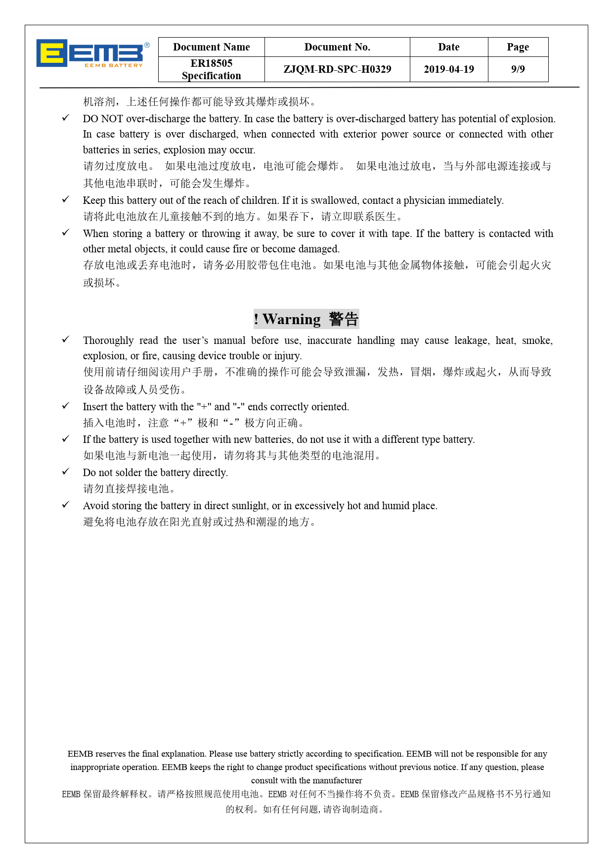 Document NameDocument No.DatePageER18505SpecificationZJQM-RD-SPC-H03292019-04-199/9 机溶剂,上述任何操作都可能导致其爆炸或损坏。 DO NOT over-discharge the battery. In case the battery is over-discharged battery has potential of explosion. In case battery is over discharged, when connected with exterior power source or connected with other batteries in series, explosion may occur. 请勿过度放电。 如果电池过度放电,电池可能会爆炸。 如果电池过放电,当与外部电源连接或与 其他电池串联时,可能会发生爆炸。 Keep this battery out of the reach of children. If it is swallowed, contact a physician immediately. 请将此电池放在儿童接触不到的地方。如果吞下,请立即联系医生。 When storing a battery or throwing it away, be sure to cover it with tape. If the battery is contacted with other metal objects, it could cause fire or become damaged. 存放电池或丢弃电池时,请务必用胶带包住电池。如果电池与其他金属物体接触,可能会引起火灾 或损坏。 ! Warning 警告 Thoroughly read the user’s manual before use, inaccurate handling may cause leakage, heat, smoke, explosion, or fire, causing device trouble or injury. 使用前请仔细阅读用户手册,不准确的操作可能会导致泄漏,发热,冒烟,爆炸或起火,从而导致 设备故障或人员受伤。 Insert the battery with the "+" and "-" ends correctly oriented. 插入电池时,注意“+”极和“-”极方向正确。 If the battery is used together with new batteries, do not use it with a different type battery. 如果电池与新电池一起使用,请勿将其与其他类型的电池混用。 Do not solder the battery directly. 请勿直接焊接电池。 Avoid storing the battery in direct sunlight, or in excessively hot and humid place. 避免将电池存放在阳光直射或过热和潮湿的地方。 EEMB reserves the final explanation. Please use battery strictly according to specification. EEMB will not be responsible for any inappropriate operation. EEMB keeps the right to change product specifications without previous notice. If any question, please consult with the manufacturer EEMB 保留最终解释权。请严格按照规范使用电池。EEMB 对任何不当操作将不负责。EEMB 保留修改产品规格书不另行通知 的权利。如有任何问题,请咨询制造商。