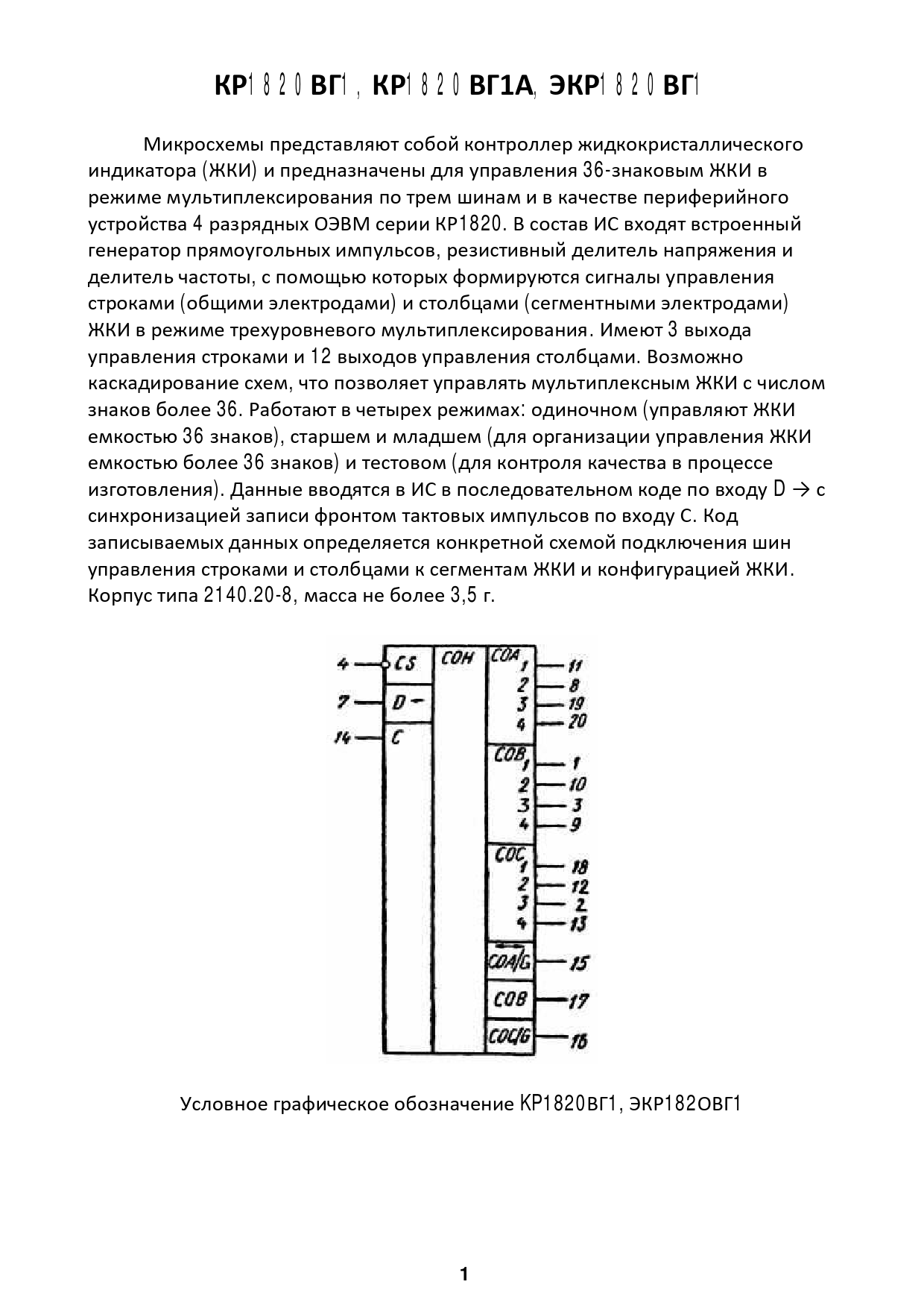 КР1820ВГ1, КР1820ВГ1А, ЭКР1820ВГ1 Микросхемы представляют собой контроллер жидкокристаллического индикатора (ЖКИ) и предназначены для управления 36-знаковым ЖКИ в режиме мультиплексирования по трем шинам и в качестве периферийного устройства 4 разрядных ОЭВМ серии КР1820. В состав ИС входят встроенный генератор прямоугольных импульсов, резистивный делитель напряжения и делитель частоты, с помощью которых формируются сигналы управления строками (общими электродами) и столбцами (сегментными электродами) ЖКИ в режиме трехуровневого мультиплексирования. Имеют 3 выхода управления строками и 12 выходов управления столбцами. Возможно каскадирование схем, что позволяет управлять мультиплексным ЖКИ с числом знаков более 36. Работают в четырех режимах: одиночном (управляют ЖКИ емкостью 36 знаков), старшем и младшем (для организации управления ЖКИ емкостью более 36 знаков) и тестовом (для контроля качества в процессе изготовления). Данные вводятся в ИС в последовательном коде по входу D → с синхронизацией записи фронтом тактовых импульсов по входу С. Код записываемых данных определяется конкретной схемой подключения шин управления строками и столбцами к сегментам ЖКИ и конфигурацией ЖКИ. Корпус типа 2140.20-8, масса не более 3,5 г. Условное графическое обозначение KP1820ВГ1, ЭКР182ОВГ1 1