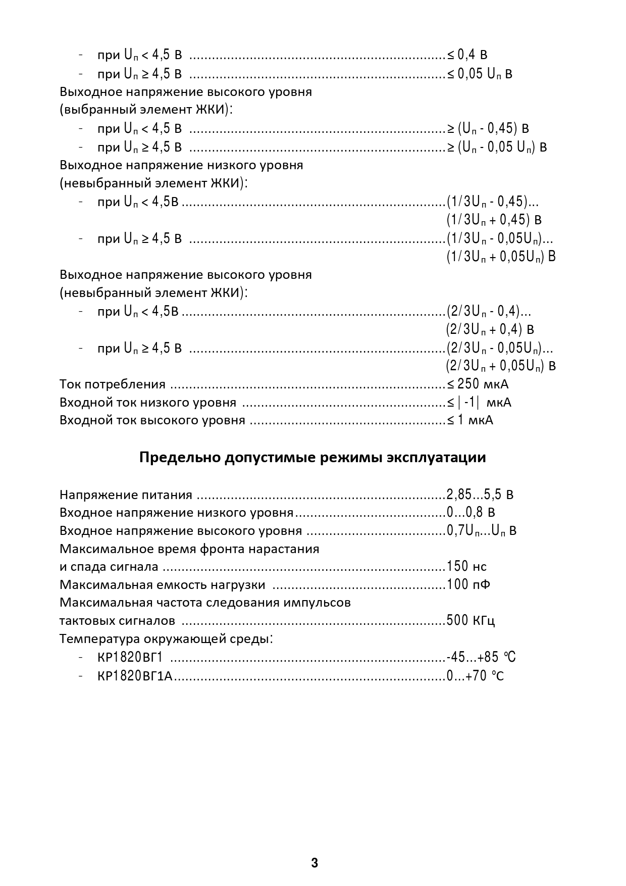 - при Uп < 4,5 В .. ≤ 0,4 В - при Uп ≥ 4,5 В .. ≤ 0,05 Uп В Выходное напряжение высокого уровня (выбранный элемент ЖКИ): - при Uп < 4,5 В .. ≥ (Uп - 0,45) В - при Uп ≥ 4,5 В .. ≥ (Uп - 0,05 Uп) В Выходное напряжение низкого уровня (невыбранный элемент ЖКИ): - при Uп < 4,5В .. (1/3Uп - 0,45)... (1/3Uп + 0,45) В - при Uп ≥ 4,5 В .. (1/3Uп - 0,05Uп)... (1/3Uп + 0,05Uп) B Выходное напряжение высокого уровня (невыбранный элемент ЖКИ): - при Uп < 4,5В .. (2/3Uп - 0,4)... (2/3Uп + 0,4) В - при Uп ≥ 4,5 В .. (2/3Uп - 0,05Uп)... (2/3Uп + 0,05Uп) В Ток потребления ... ≤ 250 мкА Входной ток низкого уровня .. ≤ |-1| мкА Входной ток высокого уровня .. ≤ 1 мкА
