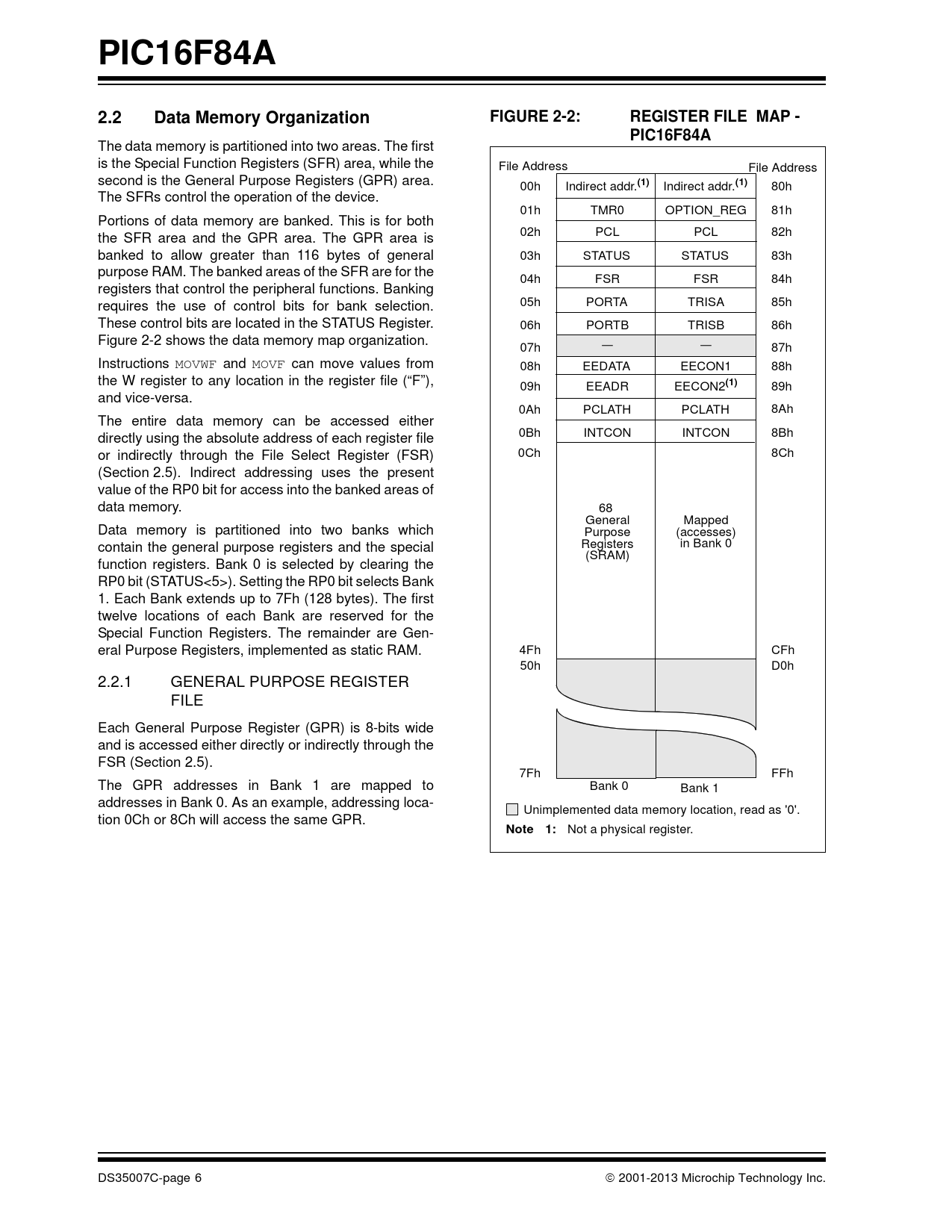 PIC16F84A 2.2 Data Memory Organization FIGURE 2-2: REGISTER FILE MAP - PIC16F84A (1) Note