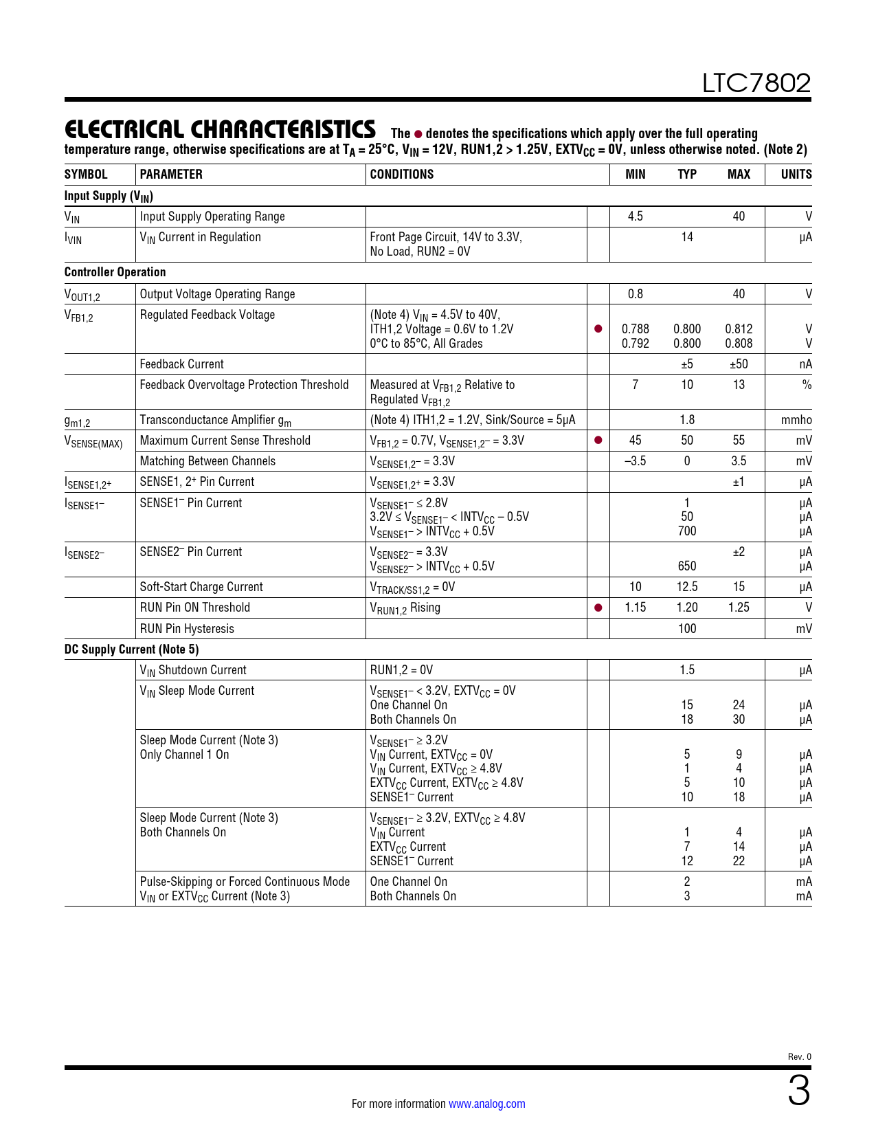 VOUT1,2 Output Voltage Operating Range 0.8 40 V VFB1,2 Regulated Feedback Voltage (Note 4) VIN = 4.5V to 40V, ITH1,2 Voltage = 0.6V to 1.2V l 0.788 0.800 0.812 V 0°C to 85°C, All Grades 0.792 0.800 0.808 V Feedback Current ±5 ±50 nA Feedback Overvoltage Protection Threshold Measured at VFB1,2 Relative to 7 10 13 % Regulated VFB1,2 gm1,2 Transconductance Amplifier gm (Note 4) ITH1,2 = 1.2V, Sink/Source = 5μA 1.8 mmho VSENSE(MAX) Maximum Current Sense Threshold VFB1,2 = 0.7V, VSENSE1,2– = 3.3V l 45 50 55 mV Matching Between Channels VSENSE1,2– = 3.3V –3.5 0 3.5 mV ISENSE1,2+ SENSE1, 2+ Pin Current VSENSE1,2+ = 3.3V ±1 µA ISENSE1– SENSE1– Pin Current VSENSE1– ≤ 2.8V 1 µA 3.2V ≤ VSENSE1– < INTVCC – 0.5V 50 µA VSENSE1– > INTVCC + 0.5V 700 µA ISENSE2– SENSE2– Pin Current VSENSE2– = 3.3V ±2 µA VSENSE2– > INTVCC + 0.5V 650 µA Soft-Start Charge Current VTRACK/SS1,2 = 0V 10 12.5 15 µA RUN Pin ON Threshold VRUN1,2 Rising l 1.15 1.20 1.25 V RUN Pin Hysteresis 100 mV