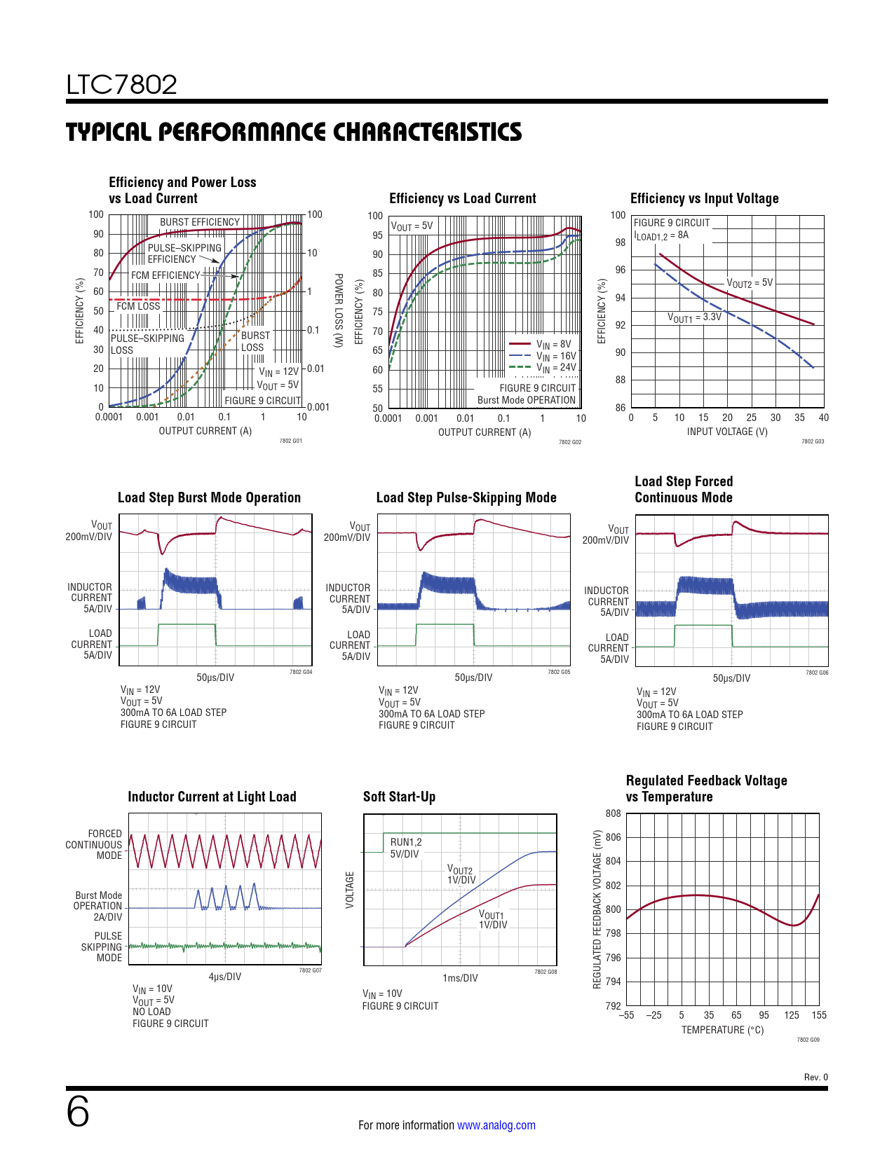 808 FORCED 806 CONTINUOUS RUN1,2 MODE 5V/DIV 804 VOUT2 TAGE (mV) 1V/DIV 802 Burst Mode TAGE OPERATION VOL 800 2A/DIV VOUT1 1V/DIV PULSE 798 SKIPPING MODE TED FEEDBACK VOL 796 4µs/DIV 7802 G07 1ms/DIV 7802 G08 794 V REGULA IN = 10V V V IN = 10V OUT = 5V NO LOAD FIGURE 9 CIRCUIT 792–55 –25 5 35 65 95 125 155 FIGURE 9 CIRCUIT TEMPERATURE (°C) 7802 G09 Rev. 0 6 For more information www.analog.com Document Outline Features Applications Typical Application Description Absolute Maximum Ratings Order Information Pin Configuration Electrical Characteristics Typical Performance Characteristics Pin Functions Functional Diagram Operation Applications Information Typical Applications Package Description Typical Application Related Parts