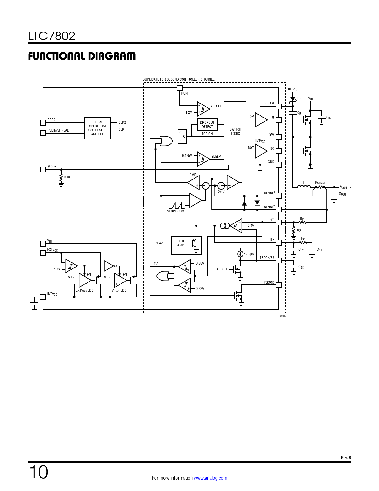 DUPLICATE FOR SECOND CONTROLLER CHANNEL INTVCC RUN DB VIN BOOST – ALLOFF 1.2V + CB TOP TG CIN FREQ SPREAD CLK2 DROPOUT SPECTRUM DETECT PLLIN/SPREAD OSCILLATOR CLK1 SWITCH AND PLL S TOP ON LOGIC SW Q R INTVCC BOT BG 0.425V + SLEEP – GND MODE ICMP 100k – + IR + L RSENSE –+ + – – VOUT1,2 2mV SENSE+ COUT SENSE– SLOPE COMP VFB R – F1 EA + 0.8V + RF2 ITH RC VIN 1.4V ITH CLAMP EXTV C CC C2 CC1 12.5µA TRACK/SS + 0V – 0.88V – C 4.7V + ALLOFF SS – – 5.1V EN 5.1V EN + + – PGOOD EXTV + 0.72V CC LDO VBIAS LDO INTVCC 7802 BD Rev. 0 10 For more information www.analog.com Document Outline Features Applications Typical Application Description Absolute Maximum Ratings Order Information Pin Configuration Electrical Characteristics Typical Performance Characteristics Pin Functions Functional Diagram Operation Applications Information Typical Applications Package Description Typical Application Related Parts