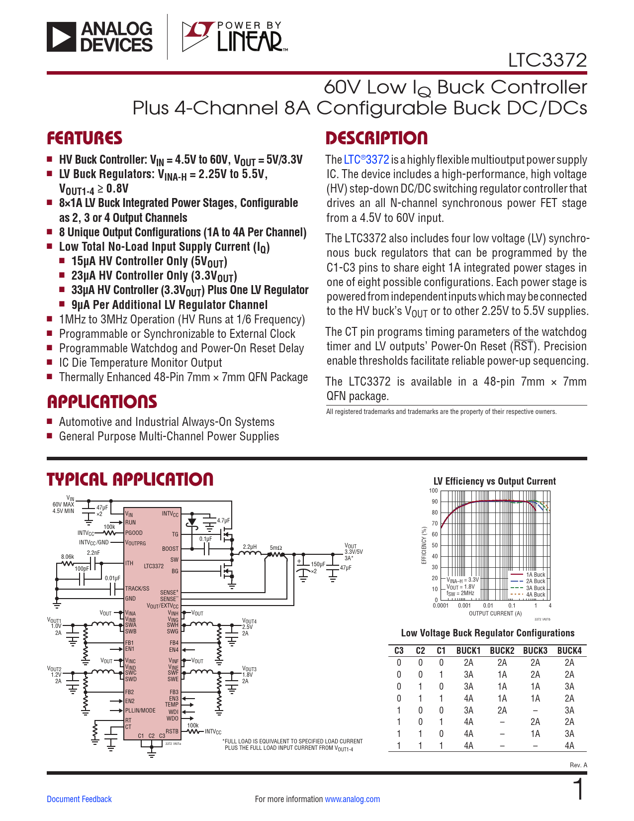 LTC3372 60V Low IQ Buck Controller Plus 4-Channel 8A Configurable Buck DC/DCs FEATURESDESCRIPTION n HV Buck Controller: VIN = 4.5V to 60V, VOUT = 5V/3.3V The LTC®3372 is a highly flexible multioutput power supply n LV Buck Regulators: VINA-H = 2.25V to 5.5V, IC. The device includes a high-performance, high voltage VOUT1-4 ≥ 0.8V (HV) step-down DC/DC switching regulator controller that n 8×1A LV Buck Integrated Power Stages, Configurable drives an all N-channel synchronous power FET stage as 2, 3 or 4 Output Channels from a 4.5V to 60V input. n 8 Unique Output Configurations (1A to 4A Per Channel) The LTC3372 also includes four low voltage (LV) synchro- n Low Total No-Load Input Supply Current (IQ) nous buck regulators that can be programmed by the n 15µA HV Controller Only (5VOUT) C1-C3 pins to share eight 1A integrated power stages in n 23μA HV Controller Only (3.3VOUT) one of eight possible configurations. Each power stage is n 33μA HV Controller (3.3VOUT) Plus One LV Regulator powered from independent inputs which may be connected n 9μA Per Additional LV Regulator Channel to the HV buck’s VOUT or to other 2.25V to 5.5V supplies. n 1MHz to 3MHz Operation (HV Runs at 1/6 Frequency) n Programmable or Synchronizable to External Clock The CT pin programs timing parameters of the watchdog n Programmable Watchdog and Power-On Reset Delay timer and LV outputs’ Power-On Reset (RST). Precision n IC Die Temperature Monitor Output enable thresholds facilitate reliable power-up sequencing. n Thermally Enhanced 48-Pin 7mm × 7mm QFN Package The LTC3372 is available in a 48-pin 7mm × 7mm QFN package. APPLICATIONS All registered trademarks and trademarks are the property of their respective owners. n Automotive and Industrial Always-On Systems n General Purpose Multi-Channel Power Supplies TYPICAL APPLICATIONLV Efficiency vs Output Current 100 VIN 90 60V MAX 47µF 4.5V MIN V INTV 80 ×2 IN CC 4.7µF RUN 70 100k INTVCC PGOOD TG 60 0.1µF INTVCC /GND VOUTPRG 2.2µH VOUT 50 BOOST 5mΩ 2.2nF 3.3V/5V 8.06k 40 SW 3A* ITH EFFICIENCY (%) 150µF 100pF LTC3372 30 BG ×2 47µF 1A Buck 0.01µF 20 VINA–H = 3.3V 2A Buck V TRACK/SS OUT = 1.8V 10 3A Buck SENSE+ fSW = 2MHz 4A Buck GND SENSE– 0 VOUT/EXTVCC 0.0001 0.001 0.01 0.1 1 4 VOUT VINA VINH VOUT OUTPUT CURRENT (A) V V 3372 TA01b VOUT1 INB ING VOUT4 1.0V SWA SWH 2.5V 2A SWB SWG 2A Low Voltage Buck Regulator Configurations FB1 FB4 EN1 EN4 C3C2 C1 BUCK1 BUCK2 BUCK3 BUCK4 VOUT VINC VINF VOUT 0 0 0 2A 2A 2A 2A V V V OUT2 IND INE VOUT3 1.2V SWC SWF 1.8V 0 0 1 3A 1A 2A 2A 2A SWD SWE 2A 0 1 0 3A 1A 1A 3A FB2 FB3 EN2 EN3 0 1 1 4A 1A 1A 2A TEMP PLLIN/MODE WDI 1 0 0 3A 2A – 3A RT WDO 100k 1 0 1 4A – 2A 2A CT RSTB INTVCC C1 C2 C3 1 1 0 4A – 1A 3A *FULL LOAD IS EQUIVALENT TO SPECIFIED LOAD CURRENT 3372 TA01a PLUS THE FULL LOAD INPUT CURRENT FROM VOUT1-4 1 1 1 4A – – 4A Rev. A Document Feedback For more information www.analog.com 1 Document Outline Features Applications Typical Application Description Absolute Maximum Ratings Order Information Electrical Characteristics Typical Performance Characteristics Pin Functions Block Diagram Operation Low Voltage Regulators Applications Information High Voltage Buck Controller Low Voltage Buck Regulators Printed Circuit Board PCB Layout Considerations Typical Applications Package Description Revision History Typical Application Related Parts