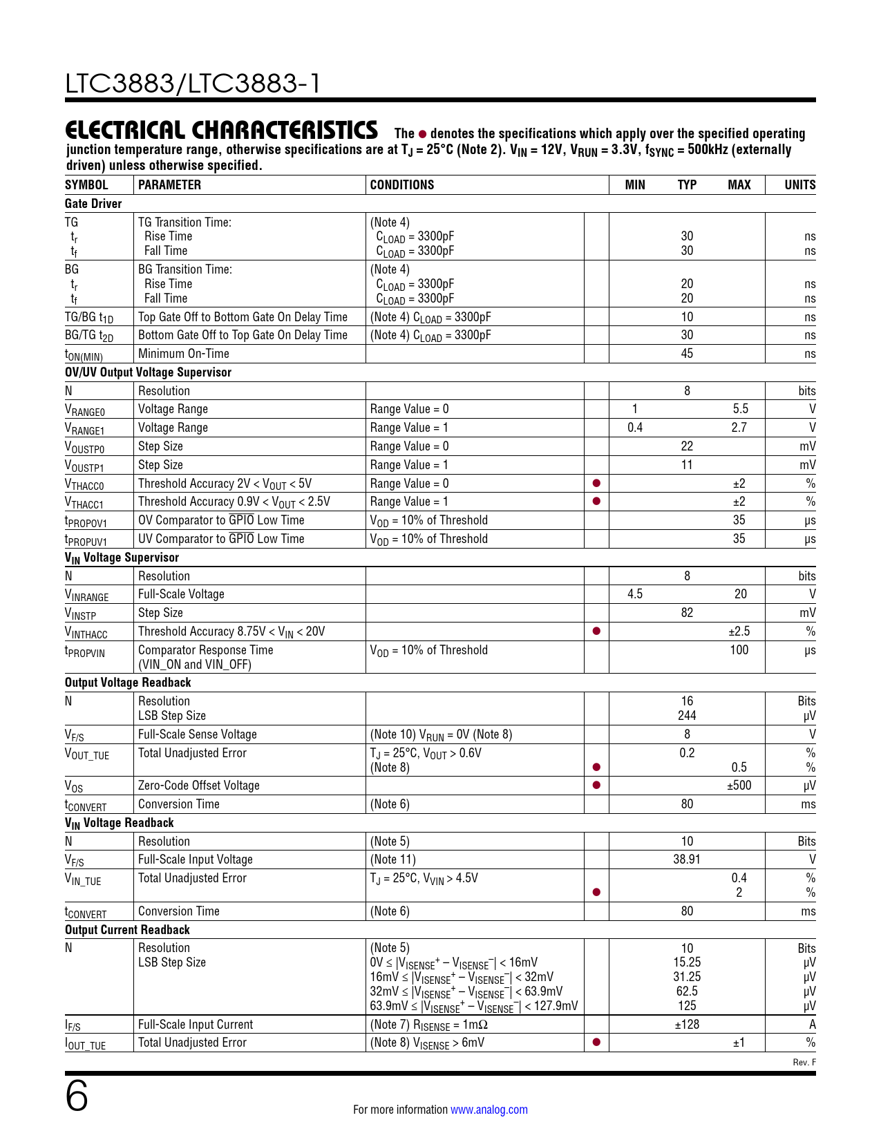 LTC3883/LTC3883-1 ELECTRICAL CHARACTERISTICSThe l denotes the specifications which apply over the specified operatingjunction temperature range, otherwise specifications are at TJ = 25°C (Note 2). VIN = 12V, VRUN = 3.3V, fSYNC = 500kHz (externallydriven) unless otherwise specified.SYMBOLPARAMETERCONDITIONSMINTYPMAXUNITSGate Driver TG TG Transition Time: (Note 4) tr Rise Time CLOAD = 3300pF 30 ns tf Fall Time CLOAD = 3300pF 30 ns BG BG Transition Time: (Note 4) tr Rise Time CLOAD = 3300pF 20 ns tf Fall Time CLOAD = 3300pF 20 ns TG/BG t1D Top Gate Off to Bottom Gate On Delay Time (Note 4) CLOAD = 3300pF 10 ns BG/TG t2D Bottom Gate Off to Top Gate On Delay Time (Note 4) CLOAD = 3300pF 30 ns tON(MIN) Minimum On-Time 45 ns OV/UV Output Voltage Supervisor N Resolution 8 bits VRANGE0 Voltage Range Range Value = 0 1 5.5 V VRANGE1 Voltage Range Range Value = 1 0.4 2.7 V VOUSTP0 Step Size Range Value = 0 22 mV VOUSTP1 Step Size Range Value = 1 11 mV VTHACC0 Threshold Accuracy 2V < VOUT < 5V Range Value = 0 l ±2 % VTHACC1 Threshold Accuracy 0.9V < VOUT < 2.5V Range Value = 1 l ±2 % tPROPOV1 OV Comparator to GPIO Low Time VOD = 10% of Threshold 35 µs tPROPUV1 UV Comparator to GPIO Low Time VOD = 10% of Threshold 35 µs VIN Voltage Supervisor N Resolution 8 bits VINRANGE Full-Scale Voltage 4.5 20 V VINSTP Step Size 82 mV VINTHACC Threshold Accuracy 8.75V < VIN < 20V l ±2.5 % tPROPVIN Comparator Response Time VOD = 10% of Threshold 100 µs (VIN_ON and VIN_OFF) Output Voltage Readback N Resolution 16 Bits LSB Step Size 244 µV VF/S Full-Scale Sense Voltage (Note 10) VRUN = 0V (Note 8) 8 V VOUT_TUE Total Unadjusted Error TJ = 25°C, VOUT > 0.6V 0.2 % (Note 8) l 0.5 % VOS Zero-Code Offset Voltage l ±500 µV tCONVERT Conversion Time (Note 6) 80 ms VIN Voltage Readback N Resolution (Note 5) 10 Bits VF/S Full-Scale Input Voltage (Note 11) 38.91 V VIN_TUE Total Unadjusted Error TJ = 25°C, VVIN > 4.5V 0.4 % l 2 % tCONVERT Conversion Time (Note 6) 80 ms Output Current Readback N Resolution (Note 5) 10 Bits LSB Step Size 0V ≤ |V + – ISENSE – VISENSE | < 16mV 15.25 µV 16mV ≤ |V + – ISENSE – VISENSE | < 32mV 31.25 µV 32mV ≤ |V + – ISENSE – VISENSE | < 63.9mV 62.5 µV 63.9mV ≤ |V + – ISENSE – VISENSE | < 127.9mV 125 µV IF/S Full-Scale Input Current (Note 7) RISENSE = 1mΩ ±128 A IOUT_TUE Total Unadjusted Error (Note 8) VISENSE > 6mV l ±1 % Rev. F 6 For more information www.analog.com Document Outline Features Applications Typical Application Description Table of Contents Absolute Maximum Ratings Pin Configuration Order Information Electrical Characteristics Typical Performance Characteristics Pin Functions Block Diagram Operation Overview Main Control Loop EEPROM Power Up and Initialization Soft-Start Sequencing Voltage-Based Sequencing Shutdown Light Load Current Operation Switching Frequency and Phase Output Voltage Sensing Output Current Sensing Auto Calibration Accurate DCR Temperature Compensation Input Current Sensing Load Sharing External/Internal Temperature Sense RCONFIG (Resistor Configuration) Pins Fault Detection and Handling Internal Memory with CRC and ECC Serial Interface Communication Failure Device Addressing Responses to VOUT and IOUT Faults Output Overvoltage Fault Response Output Undervoltage Response Peak Output Overcurrent Fault Response Responses to Timing Faults Responses to VIN OV Faults Responses to OT/UT Faults Overtemperature Fault Response—Internal Overtemperature and Undertemperature Fault Response—Externals Responses To Input Overcurrent And Output Undercurrent Faults Responses to External Faults Fault Logging Bus Timeout Failure Similarity Between PMBus, SMBus and I2C 2-Wire Interface PMBus Serial Digital Interface PMBus Command Summary PMBus Commands *Data Format Applications Information Current Limit Programming ISENSE+ and ISENSE– Pins Low Value Resistor Current Sensing Inductor DCR Current Sensing Slope Compensation and Inductor Peak Current Inductor Value Calculation Inductor Core Selection Power MOSFET and Schottky Diode (Optional) Selection Variable Delay Time, Soft-Start and Output Voltage Ramping Digital Servo Mode Soft Off (Sequenced Off) INTVCC Regulator Topside MOSFET Driver Supply (CB, DB) Undervoltage Lockout CIN and COUT Selection Fault Conditions Open-Drain Pins Phase-Locked Loop and Frequency Synchronization Minimum On-Time Considerations Input Current Sense Amplifier RCONFIG (External Resistor Configuration Pins) Voltage Selection Frequency and Phase Selection Using RCONFIG Address Selection Using RCONFIG Efficiency Considerations Checking Transient Response PolyPhase Configuration PC Board Layout Checklist PC Board Layout Debugging Design Example Connecting the USB to I2C/SMBus/PMBus Controller to the LTC3883 In System Inductor DCR Auto Calibration Accurate DCR Temperature Compensation LTpowerPlay: An Interactive GUI for Digital Power PMBus Communication and Command Processing PMBus Command Details Addressing and Write Protect General Configuration COMMANDS On/Off/Margin PWM Configuration Voltage Input Voltage and Limits Output Voltage and Limits Current Output Current Calibration Output Current Input Current Calibration Input Current Temperature External Temperature Calibration External Temperature Limits Timing Timing—On Sequence/Ramp Timing—Off Sequence/Ramp Precondition for Restart Fault Response Fault Responses All Faults Fault Responses Input Voltage Fault Responses Output Voltage Fault Responses Output Current Fault Responses IC Temperature Fault Responses External Temperature Fault Sharing Fault Sharing Propagation Fault Sharing Response Scratchpad Identification Telemetry NVM Memory Commands Store/Restore Fault Logging Block Memory Write/Read Typical Applications Package Description Revision History Typical Application Related Parts