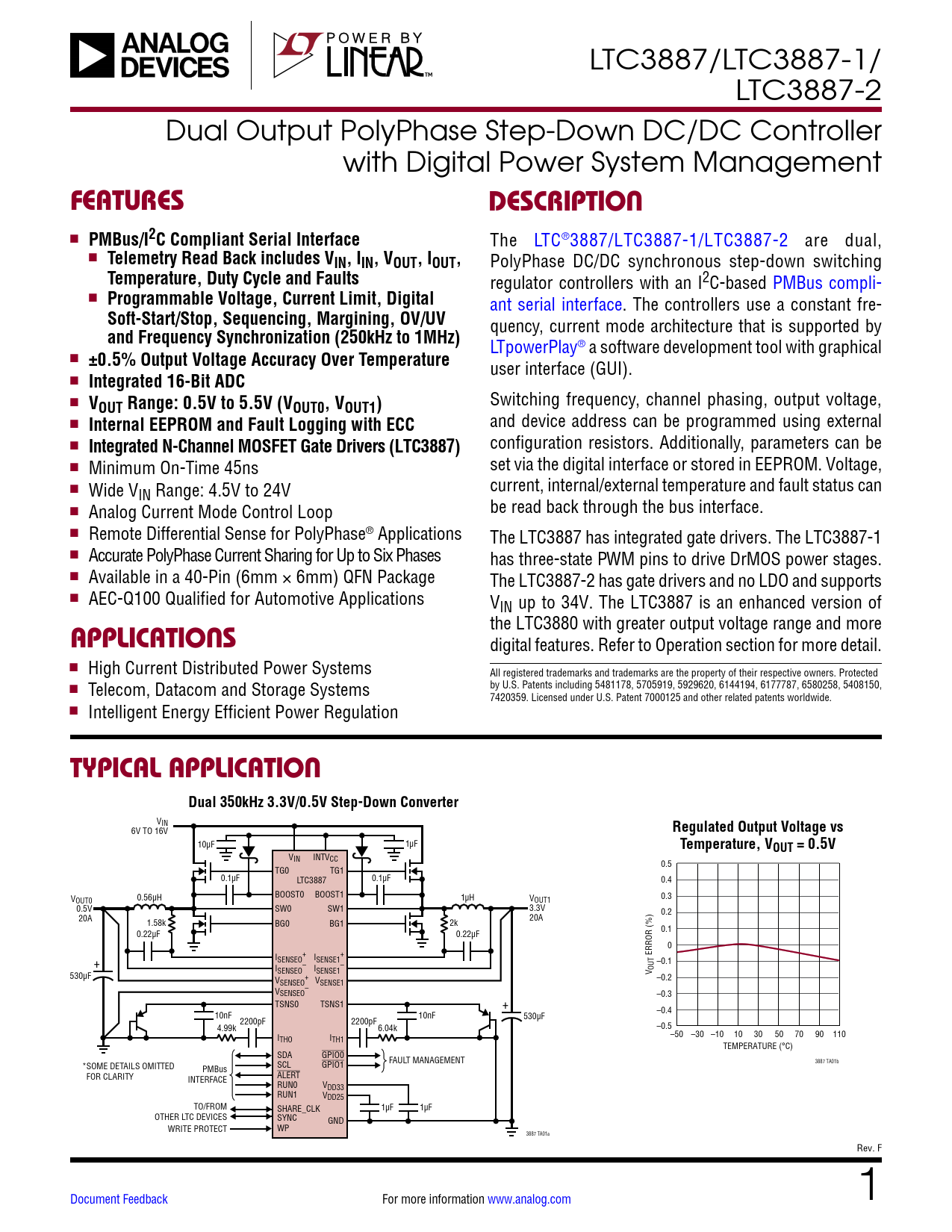 link to page 16 LTC3887/LTC3887-1/ LTC3887-2 Dual Output PolyPhase Step-Down DC/DC Controller with Digital Power System Management FEATURESDESCRIPTION n PMBus/I2C Compliant Serial Interface The LTC®3887/LTC3887-1/LTC3887-2 are dual, n Telemetry Read Back includes VIN, IIN, VOUT, IOUT, PolyPhase DC/DC synchronous step-down switching Temperature, Duty Cycle and Faults regulator controllers with an I2C-based PMBus compli- n Programmable Voltage, Current Limit, Digital ant serial interface. The controllers use a constant fre- Soft-Start/Stop, Sequencing, Margining, OV/UV quency, current mode architecture that is supported by and Frequency Synchronization (250kHz to 1MHz) LTpowerPlay® a software development tool with graphical n ±0.5% Output Voltage Accuracy Over Temperature user interface (GUI). n Integrated 16-Bit ADC n VOUT Range: 0.5V to 5.5V (VOUT0, VOUT1) Switching frequency, channel phasing, output voltage, n Internal EEPROM and Fault Logging with ECC and device address can be programmed using external n Integrated N-Channel MOSFET Gate Drivers (LTC3887) configuration resistors. Additionally, parameters can be n Minimum On-Time 45ns set via the digital interface or stored in EEPROM. Voltage, current, internal/external temperature and fault status can n Wide VIN Range: 4.5V to 24V be read back through the bus interface. n Analog Current Mode Control Loop n Remote Differential Sense for PolyPhase® Applications The LTC3887 has integrated gate drivers. The LTC3887-1 n Accurate PolyPhase Current Sharing for Up to Six Phases has three-state PWM pins to drive DrMOS power stages. n Available in a 40-Pin (6mm × 6mm) QFN Package The LTC3887-2 has gate drivers and no LDO and supports n AEC-Q100 Qualified for Automotive Applications VIN up to 34V. The LTC3887 is an enhanced version of the LTC3880 with greater output voltage range and more APPLICATIONS digital features. Refer to Operation section for more detail. n High Current Distributed Power Systems All registered trademarks and trademarks are the property of their respective owners. Protected n Telecom, Datacom and Storage Systems by U.S. Patents including 5481178, 5705919, 5929620, 6144194, 6177787, 6580258, 5408150, 7420359. Licensed under U.S. Patent 7000125 and other related patents worldwide. n Intelligent Energy Efficient Power Regulation TYPICAL APPLICATIONDual 350kHz 3.3V/0.5V Step-Down Converter VIN 6V TO 16V Regulated Output Voltage vs 10µF 1µF Temperature, VOUT = 0.5V VIN INTVCC 0.5 TG0 TG1 0.1µF 0.1µF LTC3887 0.4 V 0.56µH BOOST0 BOOST1 1µH V 0.3 OUT0 OUT1 0.5V SW0 SW1 3.3V 0.2 20A 1.58k BG0 BG1 2k 20A 0.1 0.22µF 0.22µF 0 + + ERROR (%) ISENSEO ISENSE1 –0.1 + I – – SENSEO ISENSE1 V OUT 530µF + –0.2 VSENSEO VSENSE1 V – SENSEO –0.3 TSNS0 TSNS1 + –0.4 10nF 10nF 2200pF 2200pF 530µF –0.5 4.99k 6.04k –50 –30 –10 10 30 50 70 90 110 ITHO ITH1 TEMPERATURE (°C) SDA GPIO0 FAULT MANAGEMENT 3887 TA01b *SOME DETAILS OMITTED PMBus SCL GPIO1 FOR CLARITY INTERFACE ALERT RUN0 VDD33 RUN1 VDD25 TO/FROM SHARE_CLK 1µF 1µF OTHER LTC DEVICES SYNC GND WRITE PROTECT WP 3887 TA01a Rev. F Document Feedback For more information www.analog.com 1 Document Outline Features Applications Typical Application Description Table of Contents Absolute Maximum Ratings Pin Configuration Order Information Electrical Characteristics Typical Performance Characteristics Pin Functions Block Diagram Operation Overview Main Control Loop EEPROM (NVM) Power Up and Initialization Soft-Start Sequencing EVENT-Based Sequencing Shutdown Light Load Current Operation Switching Frequency and Phase Output Voltage Sensing Current Sensing PolyPhase Load Sharing External/Internal Temperature Sense RCONFIG (Resistor Configuration) Pins Fault Detection and Handling Internal EEPROM with CRC Protection and ECC Serial Interface Communication Protection Device Addressing Responses to VOUT and IOUT Faults Output Overvoltage Fault Response Output Undervoltage Response Peak Output Overcurrent Fault Response Responses to Timing Faults Responses to VIN OV Faults Responses to OT/UT Faults Internal Overtemperature Fault/Warn Response External Overtemperature and Undertemperature Fault Response Responses to External Faults Fault Logging Bus Timeout Protection Similarity Between PMBus, SMBus and I2C 2-Wire Interface PMBus Serial Digital Interface PMBus Command Summary PMBus Commands *Data Format Applications Information Current Limit Programming ISENSE+ and ISENSE– Pins Low Value Resistor Current Sensing Inductor DCR Current Sensing Slope Compensation and Inductor Peak Current Inductor Value Calculation Inductor Core Selection Power MOSFET and Schottky Diode (Optional) Selection Variable Delay Time, Soft-Start and Output Voltage Ramping Digital Servo Mode Soft Off (Sequenced Off) INTVCC Regulator Topside MOSFET Driver Supply (CB, DB) (LTC3887, LTC3887-2) Undervoltage Lockout CIN and COUT Selection Fault Conditions Open-Drain Pins Phase-Locked Loop and Frequency Synchronization Minimum On-Time Considerations RCONFIG (External Resistor Configuration Pins) Voltage Selection Frequency and Phase Selection Using RCONFIG Address Selection Using RCONFIG Efficiency Considerations Checking Transient Response PC Board Layout Checklist PC Board Layout Debugging Design Example Additional Design Checks Connecting the USB to the I2C/SMBus/PMBus Controller to the LTC3887 In System LTpowerPlay: An Interactive GUI for Digital Power PMBus Communication and Command Processing PMBus Command Details Addressing and Write Protect General Configuration Registers On/Off/Margin PWM Config Voltage Input Voltage and Limits Output Voltage and Limits Current Input Current Calibration Output Current Calibration Input Current Output Current Temperature External Temperature Calibration External Temperature Limits Timing Timing—On Sequence/Ramp Timing—Off Sequence/Ramp Precondition for Restart Fault Response Fault Responses All Faults Fault Responses Input Voltage Fault Responses Output Voltage Faul