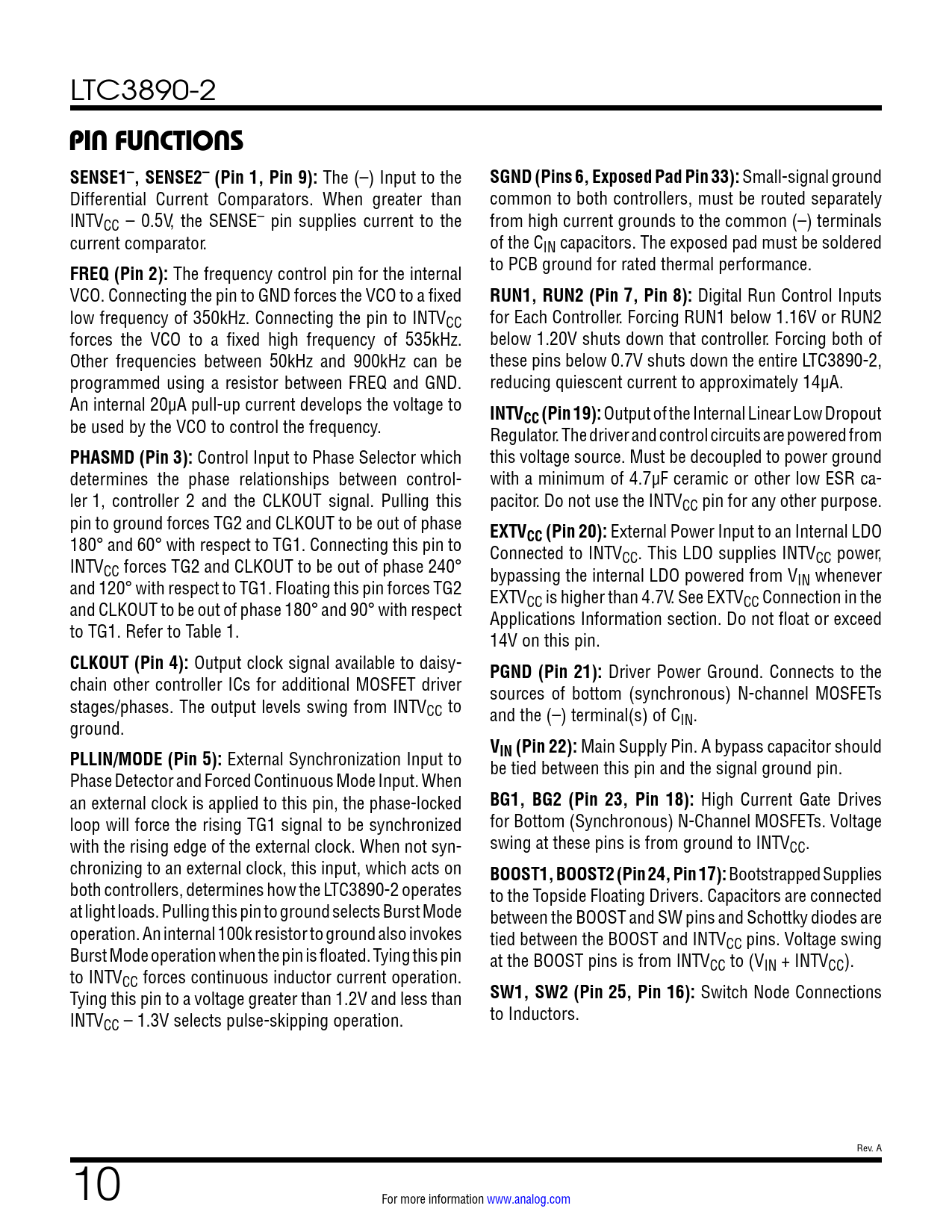 PIN FUNCTIONS. SENSE1–, SENSE2– (Pin 1, Pin 9):. SGND (Pins 6, Exposed Pad Pin 33):. FREQ (Pin 2):. RUN1, RUN2 (Pin 7, Pin 8):