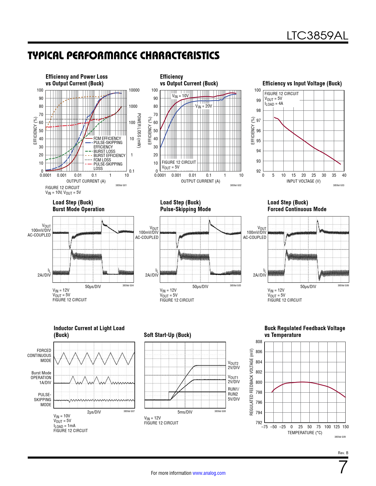 808 FORCED 806 CONTINUOUS MODE VOUT2 804 2V/DIV TAGE (mV) Burst Mode 802 OPERATION VOUT1 1A/DIV 2V/DIV 800 RUN1/ PULSE- RUN2 798 SKIPPING 5V/DIV TED FEEDBACK VOL MODE 796 2µs/DIV 3859al G07 5ms/DIV 3859al G08 794 V REGULA IN = 10V V V IN = 12V OUT = 5V FIGURE 12 CIRCUIT 792 ILOAD = 1mA –75 –50 –25 0 25 50 75 100 125 150 FIGURE 12 CIRCUIT TEMPERATURE (°C) 3859al G09 Rev. B For more information www.analog.com 7 Document Outline Features Applications Typical Application Description Absolute Maximum Ratings Pin Configuration Order Information Electrical Characteristics Typical Performance Characteristics Pin Functions Functional Diagram Operation Applications Information Typical Applications Package Description Revision History Typical Application Related Parts