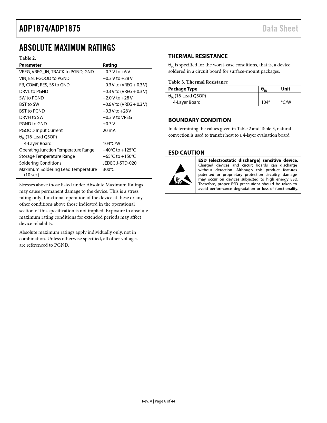 link to page 6 link to page 6 ADP1874/ADP1875Data SheetABSOLUTE MAXIMUM RATINGS Table 2.THERMAL RESISTANCEParameterRating θJA is specified for the worst-case conditions, that is, a device VREG, VREG_IN, TRACK to PGND, GND −0.3 V to +6 V soldered in a circuit board for surface-mount packages. VIN, EN, PGOOD to PGND −0.3 V to +28 V FB, COMP, RES, SS to GND −0.3 V to (VREG + 0.3 V) Table 3. Thermal Resistance DRVL to PGND −0.3 V to (VREG + 0.3 V) Package TypeθUnitJA SW to PGND −2.0 V to +28 V θ (16-Lead QSOP) JA BST to SW −0.6 V to (VREG + 0.3 V) 4-Layer Board 104° °C/W BST to PGND −0.3 V to +28 V DRVH to SW −0.3 V to VREG BOUNDARY CONDITION PGND to GND ±0.3 V PGOOD Input Current 20 mA In determining the values given in Table 2 and Table 3, natural θ (16-Lead QSOP) convection is used to transfer heat to a 4-layer evaluation board. JA 4-Layer Board 104°C/W Operating Junction Temperature Range −40°C to +125°C ESD CAUTION Storage Temperature Range −65°C to +150°C Soldering Conditions JEDEC J-STD-020 Maximum Soldering Lead Temperature 300°C (10 sec) Stresses above those listed under Absolute Maximum Ratings may cause permanent damage to the device. This is a stress rating only; functional operation of the device at these or any other conditions above those indicated in the operational section of this specification is not implied. Exposure to absolute maximum rating conditions for extended periods may affect device reliability. Absolute maximum ratings apply individually only, not in combination. Unless otherwise specified, all other voltages are referenced to PGND. Rev. A | Page 6 of 44 Document Outline Features Applications General Description Typical Applications Circuit Table of Contents Revision History Specifications Absolute Maximum Ratings Thermal Resistance Boundary Condition ESD Caution Pin Configuration and Function Descriptions Typical Performance Characteristics ADP1874/ADP1875 Block Digram Theory of Operation Startup Soft Start Precision Enable Circuitry Undervoltage Lockout On-Board Low Dropout Regulator Thermal Shutdown Programming Resistor (RES) Detect Circuit Valley Current-Limit Setting Hiccup Mode During Short Circuit Synchronous Rectifier ADP1875 Power Saving Mode (PSM) Timer Operation Pseudo-Fixed Frequency Power Good Monitoring Voltage Tracking Applications Information Feedback Resistor Divider Inductor Selection Output Ripple Voltage (ΔVRR) Output Capacitor Selection Compensation Network Output Filter Impedance (ZFILT) Error Amplifier Output Impedance (ZCOMP) Error Amplifier Gain (Gm) Current-Sense Loop Gain (GCS) Crossover Frequency Efficiency Consideration Channel Conduction Loss MOSFET Driver Loss Switching Loss Diode Conduction Loss Inductor Loss Input Capacitor Selection Thermal Considerations Design Example Input Capacitor Inductor Current Limit Programming Output Capacitor Feedback Resistor Network Setup Compensation Network Loss Calculations External Component Recommendations Layout Considerations IC Section (Left Side of Evaluation Board) Power Section Differential Sensing Typical Application Circuits 12 A, 300 kHz High Current Application Circuit 5.5 V Input, 600 kHz Application Circuit 300 kHz High Current Application Circuit Outline Dimensions Ordering Guide