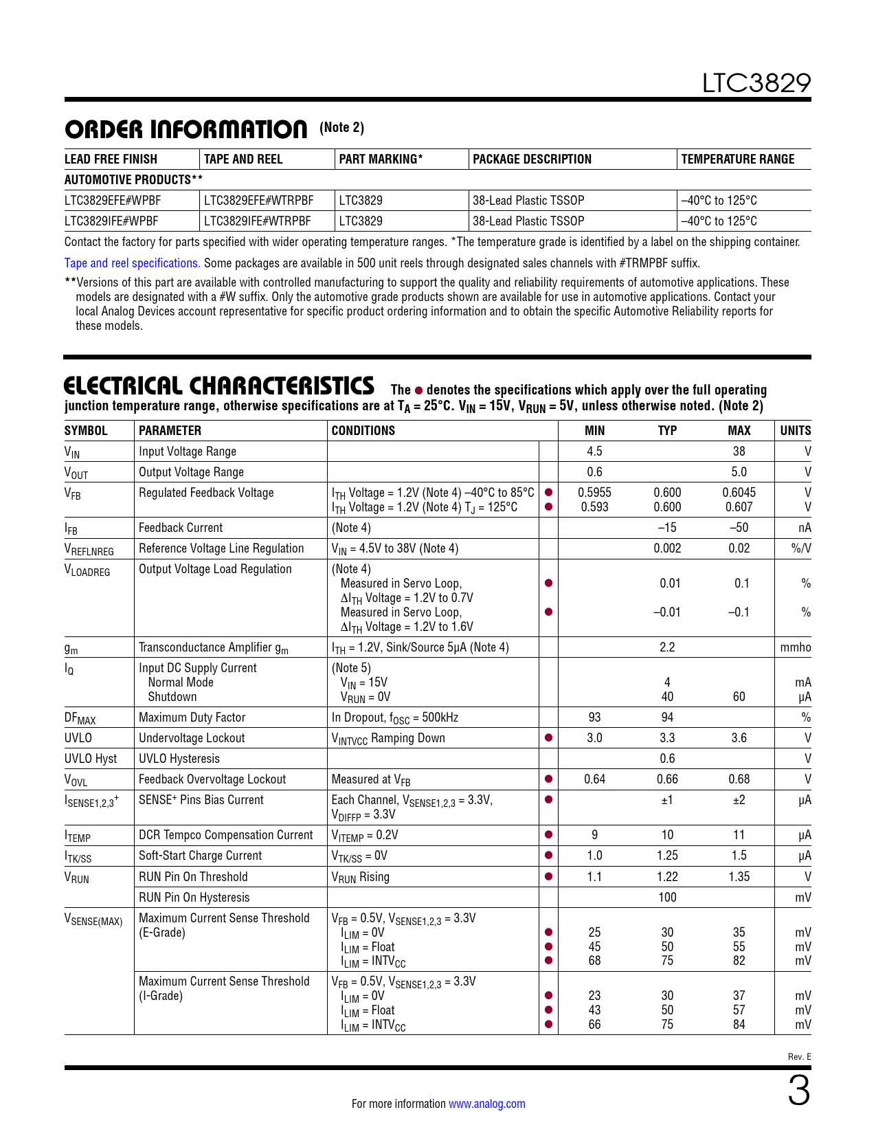 LTC3829 ORDER INFORMATION (Note 2) LEAD FREE FINISHTAPE AND REELPART MARKING*PACKAGE DESCRIPTIONTEMPERATURE RANGEAUTOMOTIVE PRODUCTS** LTC3829EFE#WPBF LTC3829EFE#WTRPBF LTC3829 38-Lead Plastic TSSOP –40°C to 125°C LTC3829IFE#WPBF LTC3829IFE#WTRPBF LTC3829 38-Lead Plastic TSSOP –40°C to 125°C Contact the factory for parts specified with wider operating temperature ranges. *The temperature grade is identified by a label on the shipping container. Tape and reel specifications. Some packages are available in 500 unit reels through designated sales channels with #TRMPBF suffix. ** Versions of this part are available with controlled manufacturing to support the quality and reliability requirements of automotive applications. These models are designated with a #W suffix. Only the automotive grade products shown are available for use in automotive applications. Contact your local Analog Devices account representative for specific product ordering information and to obtain the specific Automotive Reliability reports for these models. ELECTRICAL CHARACTERISTICSThe l denotes the specifications which apply over the full operatingjunction temperature range, otherwise specifications are at TA = 25°C. VIN = 15V, VRUN = 5V, unless otherwise noted. (Note 2) SYMBOLPARAMETERCONDITIONSMINTYPMAXUNITS VIN Input Voltage Range 4.5 38 V VOUT Output Voltage Range 0.6 5.0 V VFB Regulated Feedback Voltage ITH Voltage = 1.2V (Note 4) –40°C to 85°C l 0.5955 0.600 0.6045 V ITH Voltage = 1.2V (Note 4) TJ = 125°C l 0.593 0.600 0.607 V IFB Feedback Current (Note 4) –15 –50 nA VREFLNREG Reference Voltage Line Regulation VIN = 4.5V to 38V (Note 4) 0.002 0.02 %/V VLOADREG Output Voltage Load Regulation (Note 4) Measured in Servo Loop, l 0.01 0.1 % ∆ITH Voltage = 1.2V to 0.7V Measured in Servo Loop, l –0.01 –0.1 % ∆ITH Voltage = 1.2V to 1.6V gm Transconductance Amplifier gm ITH = 1.2V, Sink/Source 5µA (Note 4) 2.2 mmho IQ Input DC Supply Current (Note 5) Normal Mode VIN = 15V 4 mA Shutdown VRUN = 0V 40 60 µA DFMAX Maximum Duty Factor In Dropout, fOSC = 500kHz 93 94 % UVLO Undervoltage Lockout VINTVCC Ramping Down l 3.0 3.3 3.6 V UVLO Hyst UVLO Hysteresis 0.6 V VOVL Feedback Overvoltage Lockout Measured at VFB l 0.64 0.66 0.68 V I + SENSE1,2,3 SENSE+ Pins Bias Current Each Channel, VSENSE1,2,3 = 3.3V, l ±1 ±2 µA VDIFFP = 3.3V ITEMP DCR Tempco Compensation Current VITEMP = 0.2V l 9 10 11 µA ITK/SS Soft-Start Charge Current VTK/SS = 0V l 1.0 1.25 1.5 µA VRUN RUN Pin On Threshold VRUN Rising l 1.1 1.22 1.35 V RUN Pin On Hysteresis 100 mV VSENSE(MAX) Maximum Current Sense Threshold VFB = 0.5V, VSENSE1,2,3 = 3.3V (E-Grade) ILIM = 0V l 25 30 35 mV ILIM = Float l 45 50 55 mV ILIM = INTVCC l 68 75 82 mV Maximum Current Sense Threshold VFB = 0.5V, VSENSE1,2,3 = 3.3V (I-Grade) ILIM = 0V l 23 30 37 mV ILIM = Float l 43 50 57 mV ILIM = INTVCC l 66 75 84 mV Rev. E For more information www.analog.com 3 Document Outline Features Applications Typical Application Description Absolute Maximum Ratings Pin Configuration Order Information Electrical Characteristics Typical Performance Characteristics Pin Functions Functional Diagram Operation Applications Information Typical Application Package Description Revision History Typical Application Related Parts