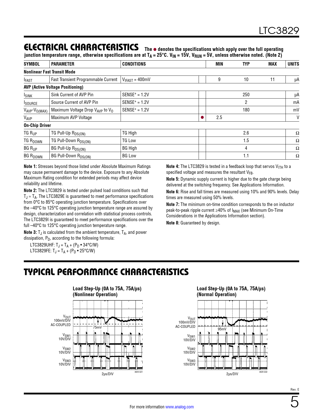link to page 2 link to page 14 link to page 14 LTC3829 ELECTRICAL CHARACTERISTICSThe l denotes the specifications which apply over the full operatingjunction temperature range, otherwise specifications are at TA = 25°C. VIN = 15V, VRUN = 5V, unless otherwise noted. (Note 2)SYMBOLPARAMETERCONDITIONSMINTYPMAXUNITSNonlinear Fast Transit Mode IFAST Fast Transient Programmable Current VIFAST = 400mV 9 10 11 µA AVP (Active Voltage Positioning) ISINK Sink Current of AVP Pin SENSE+ = 1.2V 250 µA ISOURCE Source Current of AVP Pin SENSE+ = 1.2V 2 mA VAVP-VO(MAX) Maximum Voltage Drop VAVP to VO SENSE+ = 1.2V 180 mV VAVP Maximum AVP Voltage l 2.5 V On-Chip Driver TG RUP TG Pull-Up RDS(ON) TG High 2.6 Ω TG RDOWN TG Pull-Down RDS(ON) TG Low 1.5 Ω BG RUP BG Pull-Up RDS(ON) BG High 4 Ω BG RDOWN BG Pull-Down RDS(ON) BG Low 1.1 Ω Note 1: Stresses beyond those listed under Absolute Maximum Ratings Note 4: The LTC3829 is tested in a feedback loop that servos VITH to a may cause permanent damage to the device. Exposure to any Absolute specified voltage and measures the resultant VFB. Maximum Rating condition for extended periods may affect device Note 5: Dynamic supply current is higher due to the gate charge being reliability and lifetime. delivered at the switching frequency. See Applications Information. Note 2: The LTC3829 is tested under pulsed load conditions such that Note 6: Rise and fall times are measured using 10% and 90% levels. Delay TJ ≈ TA. The LTC3829E is guaranteed to meet performance specifications times are measured using 50% levels. from 0°C to 85°C operating junction temperature. Specifications over Note 7: The minimum on-time condition corresponds to the on inductor the –40°C to 125°C operating junction temperature range are assured by peak-to-peak ripple current ≥40% of I design, characterization and correlation with statistical process controls. MAX (see Minimum On-Time Considerations in the Applications Information section). The LTC3829I is guaranteed to meet performance specifications over the full –40°C to 125°C operating junction temperature range. Note 8: Guaranteed by design. Note 3: TJ is calculated from the ambient temperature, TA, and power dissipation, PD, according to the following formula: LTC3829UHF: TJ = TA + (PD • 34°C/W) LTC3829FE: TJ = TA + (PD • 25°C/W) TYPICAL PERFORMANCE CHARACTERISTICSLoad Step-Up (0A to 75A, 75A/µs)Load Step-Up (0A to 75A, 75A/µs)(Nonlinear Operation)(Normal Operation) VOUT V 100mV/DIV OUT 100mV/DIV AC-COUPLED 75mV AC-COUPLED 95mV VSW1 V 10V/DIV SW1 10V/DIV VSW2 VSW2 10V/DIV 10V/DIV VSW3 VSW3 10V/DIV 10V/DIV 2µs/DIV 3829 G01 2µs/DIV 3829 G02 Rev. E For more information www.analog.com 5 Document Outline Features Applications Typical Application Description Absolute Maximum Ratings Pin Configuration Order Information Electrical Characteristics Typical Performance Characteristics Pin Functions Functional Diagram Operation Applications Information Typical Application Package Description Revision History Typical Application Related Parts