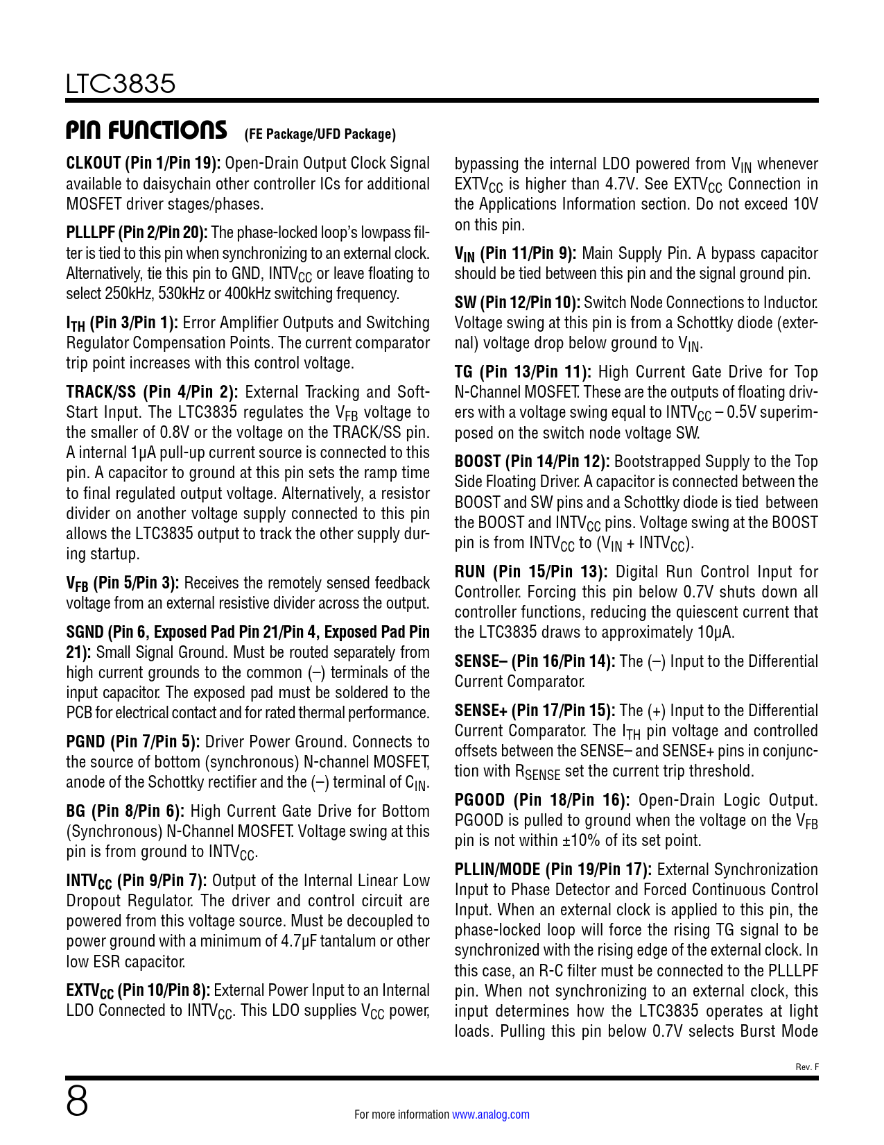 link to page 13 LTC3835 PIN FUNCTIONS (FE Package/UFD Package)CLKOUT (Pin 1/Pin 19): Open-Drain Output Clock Signal bypassing the internal LDO powered from VIN whenever available to daisychain other controller ICs for additional EXTVCC is higher than 4.7V. See EXTVCC Connection in MOSFET driver stages/phases. the Applications Information section. Do not exceed 10V PLLLPF (Pin 2/Pin 20): The phase-locked loop’s lowpass fil- on this pin. ter is tied to this pin when synchronizing to an external clock. VIN (Pin 11/Pin 9): Main Supply Pin. A bypass capacitor Alternatively, tie this pin to GND, INTVCC or leave floating to should be tied between this pin and the signal ground pin. select 250kHz, 530kHz or 400kHz switching frequency. SW (Pin 12/Pin 10): Switch Node Connections to Inductor. ITH (Pin 3/Pin 1): Error Amplifier Outputs and Switching Voltage swing at this pin is from a Schottky diode (exter- Regulator Compensation Points. The current comparator nal) voltage drop below ground to VIN. trip point increases with this control voltage. TG (Pin 13/Pin 11): High Current Gate Drive for Top TRACK/SS (Pin 4/Pin 2): External Tracking and Soft- N-Channel MOSFET. These are the outputs of floating driv- Start Input. The LTC3835 regulates the VFB voltage to ers with a voltage swing equal to INTVCC – 0.5V superim- the smaller of 0.8V or the voltage on the TRACK/SS pin. posed on the switch node voltage SW. A internal 1µA pull-up current source is connected to this BOOST (Pin 14/Pin 12): Bootstrapped Supply to the Top pin. A capacitor to ground at this pin sets the ramp time Side Floating Driver. A capacitor is connected between the to final regulated output voltage. Alternatively, a resistor BOOST and SW pins and a Schottky diode is tied between divider on another voltage supply connected to this pin the BOOST and INTV allows the LTC3835 output to track the other supply dur- CC pins. Voltage swing at the BOOST pin is from INTV ing startup. CC to (VIN + INTVCC). RUN (Pin 15/Pin 13): Digital Run Control Input for VFB (Pin 5/Pin 3): Receives the remotely sensed feedback Controller. Forcing this pin below 0.7V shuts down all voltage from an external resistive divider across the output. controller functions, reducing the quiescent current that SGND (Pin 6, Exposed Pad Pin 21/Pin 4, Exposed Pad Pin the LTC3835 draws to approximately 10µA. 21): Small Signal Ground. Must be routed separately from SENSE– (Pin 16/Pin 14): The (–) Input to the Differential high current grounds to the common (–) terminals of the Current Comparator. input capacitor. The exposed pad must be soldered to the PCB for electrical contact and for rated thermal performance. SENSE+ (Pin 17/Pin 15): The (+) Input to the Differential Current Comparator. The I PGND (Pin 7/Pin 5): Driver Power Ground. Connects to TH pin voltage and controlled offsets between the SENSE– and SENSE+ pins in conjunc- the source of bottom (synchronous) N-channel MOSFET, tion with R anode of the Schottky rectifier and the (–) terminal of C SENSE set the current trip threshold. IN. PGOOD (Pin 18/Pin 16): Open-Drain Logic Output. BG (Pin 8/Pin 6): High Current Gate Drive for Bottom PGOOD is pulled to ground when the voltage on the V (Synchronous) N-Channel MOSFET. Voltage swing at this FB pin is not within ±10% of its set point. pin is from ground to INTVCC. PLLIN/MODE (Pin 19/Pin 17): External Synchronization INTVCC (Pin 9/Pin 7): Output of the Internal Linear Low Input to Phase Detector and Forced Continuous Control Dropout Regulator. The driver and control circuit are Input. When an external clock is applied to this pin, the powered from this voltage source. Must be decoupled to phase-locked loop will force the rising TG signal to be power ground with a minimum of 4.7µF tantalum or other synchronized with the rising edge of the external clock. In low ESR capacitor. this case, an R-C filter must be connected to the PLLLPF EXTVCC (Pin 10/Pin 8): External Power Input to an Internal pin. When not synchronizing to an external clock, this LDO Connected to INTVCC. This LDO supplies VCC power, input determines how the LTC3835 operates at light loads. Pulling this pin below 0.7V selects Burst Mode Rev. F 8 For more information www.analog.com Document Outline Features Applications Typical Application Description Absolute Maximum Ratings Pin Configuration Order Information Electrical Characteristics Typical Performance Characteristics Pin Functions Functional Diagram Operation Applications Information Package Description Revision History Typical Application Related Parts