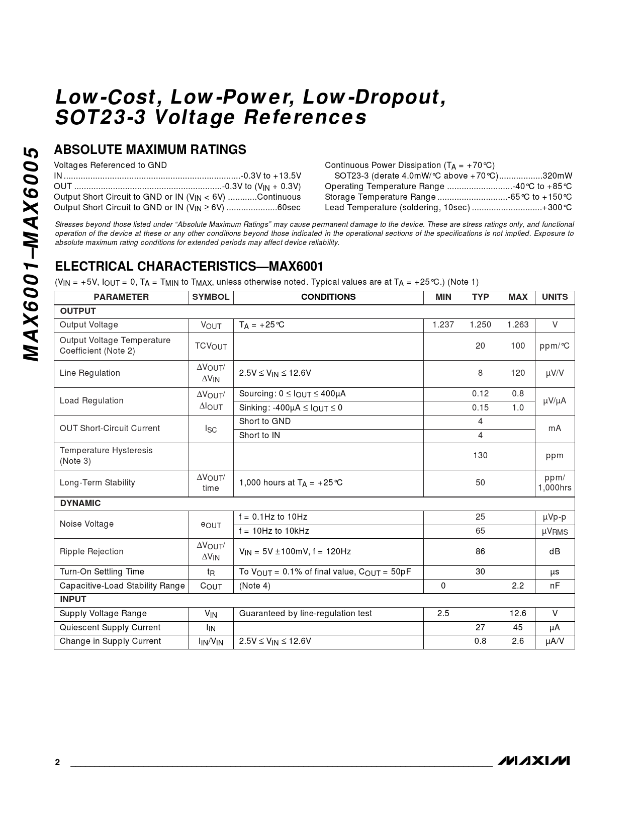 Low-Cost, Low-Power, Low-Dropout, SOT23-3 Voltage ReferencesABSOLUTE MAXIMUM RATINGS Voltages Referenced to GND Continuous Power Dissipation (TA = +70°C) IN ...-0.3V to +13.5V SOT23-3 (derate 4.0mW/°C above +70°C)..320mW OUT ...-0.3V to (VIN + 0.3V) Operating Temperature Range ...-40°C to +85°C Output Short Circuit to GND or IN (VIN < 6V) ..Continuous Storage Temperature Range ...-65°C to +150°C Output Short Circuit to GND or IN (VIN ≥ 6V) ...60sec Lead Temperature (soldering, 10sec) ...+300°C Stresses beyond those listed under “Absolute Maximum Ratings” may cause permanent damage to the device. These are stress ratings only, and functional operation of the device at these or any other conditions beyond those indicated in the operational sections of the specifications is not implied. Exposure to absolute maximum rating conditions for extended periods may affect device reliability. ELECTRICAL CHARACTERISTICS—MAX6001 (VIN = +5V, IOUT = 0, TA = TMIN to TMAX, unless otherwise noted. Typical values are at TA = +25°C.) (Note 1) PARAMETERSYMBOLCONDITIONSMINTYPMAXUNITSOUTPUT Output Voltage VOUT TA = +25°C 1.237 1.250 1.263 V Output Voltage Temperature TCVOUT 20 100 ppm/°C MAX6001–MAX6005 Coefficient (Note 2) ∆VOUT/ Line Regulation 2.5V ≤ VIN ≤ 12.6V 8 120 µV/V ∆VIN ∆V Sourcing: 0 OUT/ ≤ IOUT ≤ 400µA 0.12 0.8 Load Regulation ∆ µV/µA IOUT Sinking: -400µA ≤ IOUT ≤ 0 0.15 1.0 Short to GND 4 OUT Short-Circuit Current ISC mA Short to IN 4 Temperature Hysteresis 130 ppm (Note 3) ∆VOUT/ ppm/ Long-Term Stability 1,000 hours at TA = +25°C 50 time 1,000hrs DYNAMIC f = 0.1Hz to 10Hz 25 µVp-p Noise Voltage eOUT f = 10Hz to 10kHz 65 µVRMS ∆VOUT/ Ripple Rejection VIN = 5V ±100mV, f = 120Hz 86 dB ∆VIN Turn-On Settling Time tR To VOUT = 0.1% of final value, COUT = 50pF 30 µs Capacitive-Load Stability Range COUT (Note 4) 0 2.2 nF INPUT Supply Voltage Range VIN Guaranteed by line-regulation test 2.5 12.6 V Quiescent Supply Current IIN 27 45 µA Change in Supply Current IIN/VIN 2.5V ≤ VIN ≤ 12.6V 0.8 2.6 µA/V 2_______________________________________________________________________________________