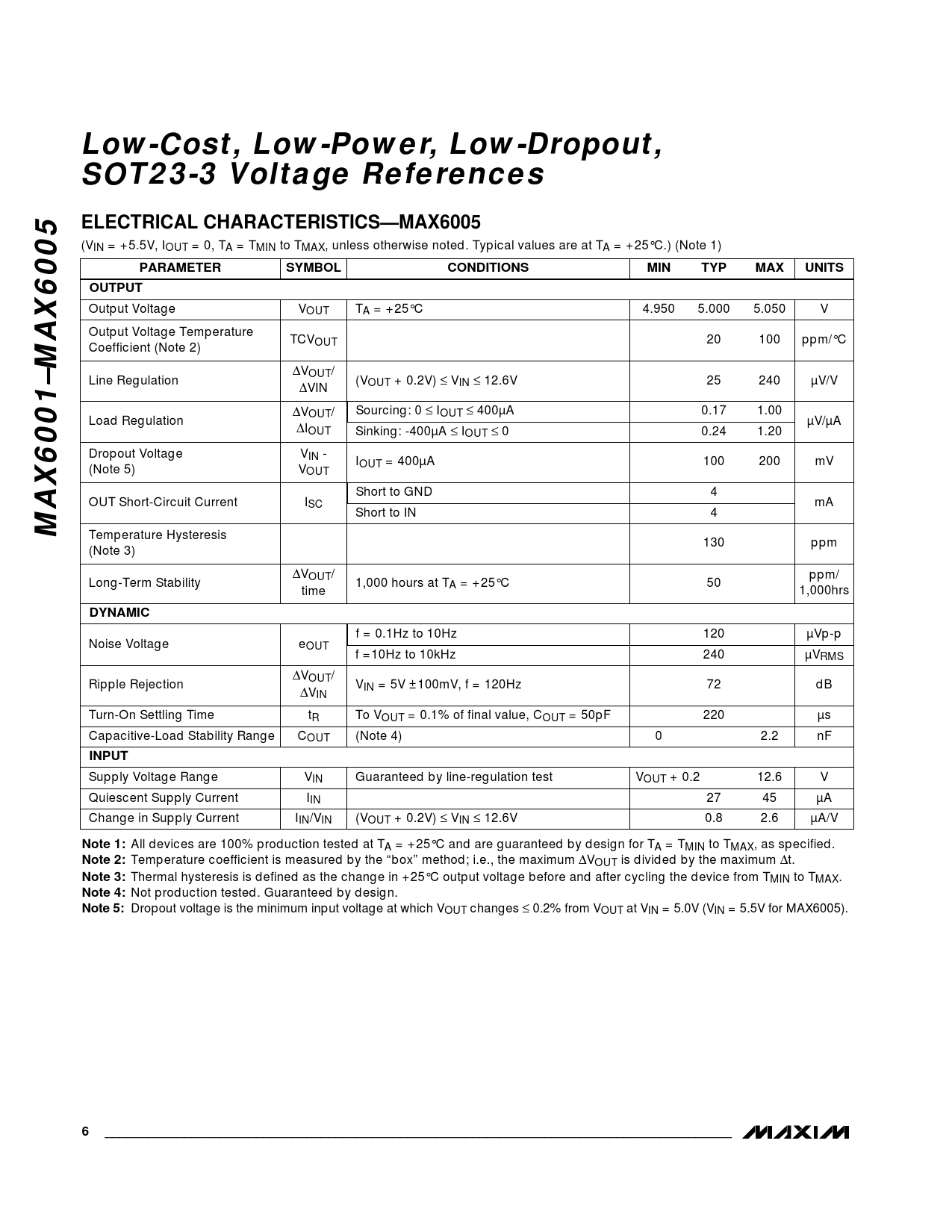 Low-Cost, Low-Power, Low-Dropout, SOT23-3 Voltage ReferencesELECTRICAL CHARACTERISTICS—MAX6005 (VIN = +5.5V, IOUT = 0, TA = TMIN to TMAX, unless otherwise noted. Typical values are at TA = +25°C.) (Note 1) PARAMETERSYMBOLCONDITIONSMINTYPMAXUNITS OUTPUT OUTPUT Output Voltage VOUT TA = +25°C 4.950 5.000 5.050 V Output Voltage Temperature TCVOUT 20 100 ppm/°C Coefficient (Note 2) ∆VOUT/ Line Regulation ∆ (VOUT + 0.2V) ≤ VIN ≤ 12.6V 25 240 µV/V VIN ∆VOUT/ Sourcing: 0 ≤ IOUT ≤ 400µA 0.17 1.00 Load Regulation ∆ µV/µA IOUT Sinking: -400µA ≤ IOUT ≤ 0 0.24 1.20 Dropout Voltage VIN - IOUT = 400µA 100 200 mV (Note 5) VOUT Short to GND 4 OUT Short-Circuit Current ISC mA Short to IN 4 MAX6001–MAX6005 Temperature Hysteresis 130 ppm (Note 3) ∆VOUT/ ppm/ Long-Term Stability 1,000 hours at TA = +25°C 50 time 1,000hrs DYNAMIC f = 0.1Hz to 10Hz 120 µVp-p Noise Voltage eOUT f =10Hz to 10kHz 240 µVRMS ∆VOUT/ Ripple Rejection ∆ VIN = 5V ±100mV, f = 120Hz 72 dB VIN Turn-On Settling Time tR To VOUT = 0.1% of final value, COUT = 50pF 220 µs Capacitive-Load Stability Range COUT (Note 4) 0 2.2 nF INPUT Supply Voltage Range VIN Guaranteed by line-regulation test VOUT + 0.2 12.6 V Quiescent Supply Current IIN 27 45 µA Change in Supply Current IIN/VIN (VOUT + 0.2V) ≤ VIN ≤ 12.6V 0.8 2.6 µA/V Note 1: All devices are 100% production tested at TA = +25°C and are guaranteed by design for TA = TMIN to TMAX, as specified. Note 2: Temperature coefficient is measured by the “box” method; i.e., the maximum ∆VOUT is divided by the maximum ∆t. Note 3: Thermal hysteresis is defined as the change in +25°C output voltage before and after cycling the device from TMIN to TMAX. Note 4: Not production tested. Guaranteed by design. Note 5: Dropout voltage is the minimum input voltage at which VOUT changes ≤ 0.2% from VOUT at VIN = 5.0V (VIN = 5.5V for MAX6005). 6_______________________________________________________________________________________