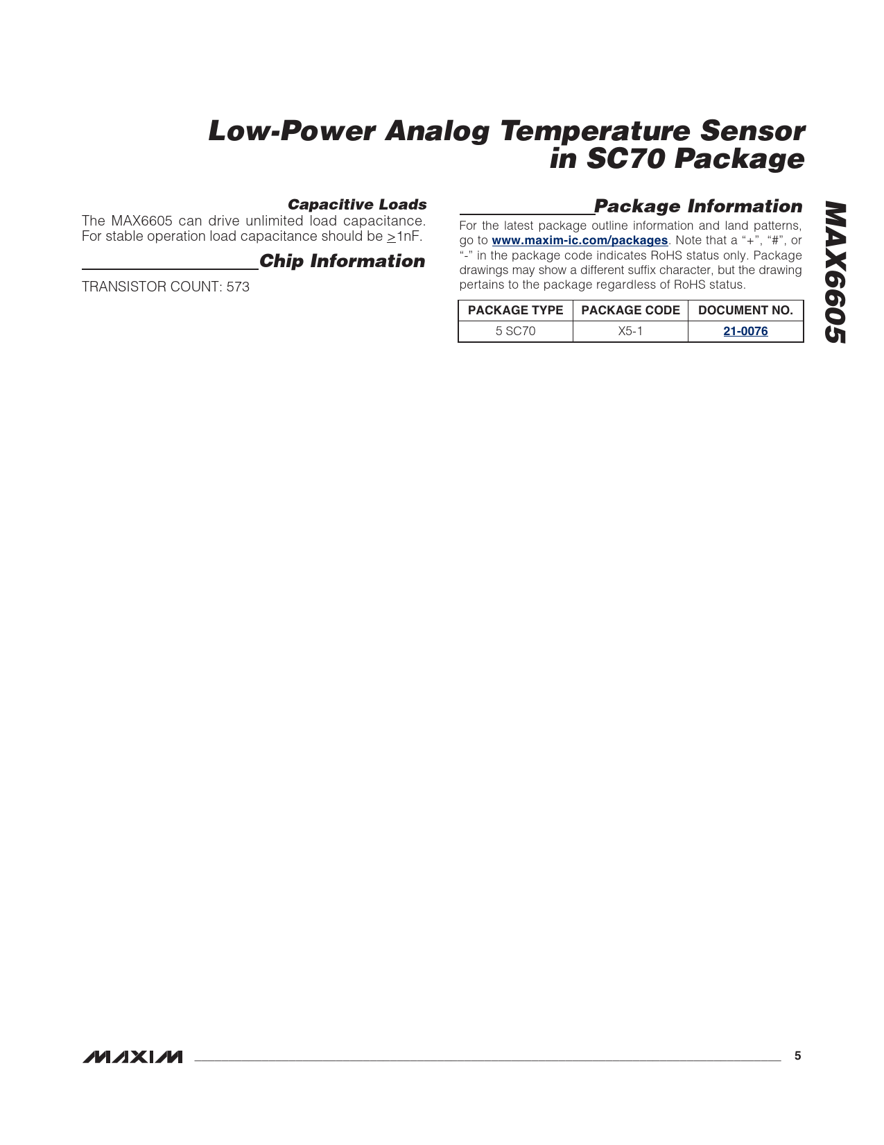Low-Power Analog Temperature Sensor. in SC70 Package. MAX6605. Capacitive Loads. Package Information. www.maxim-ic.com/packages