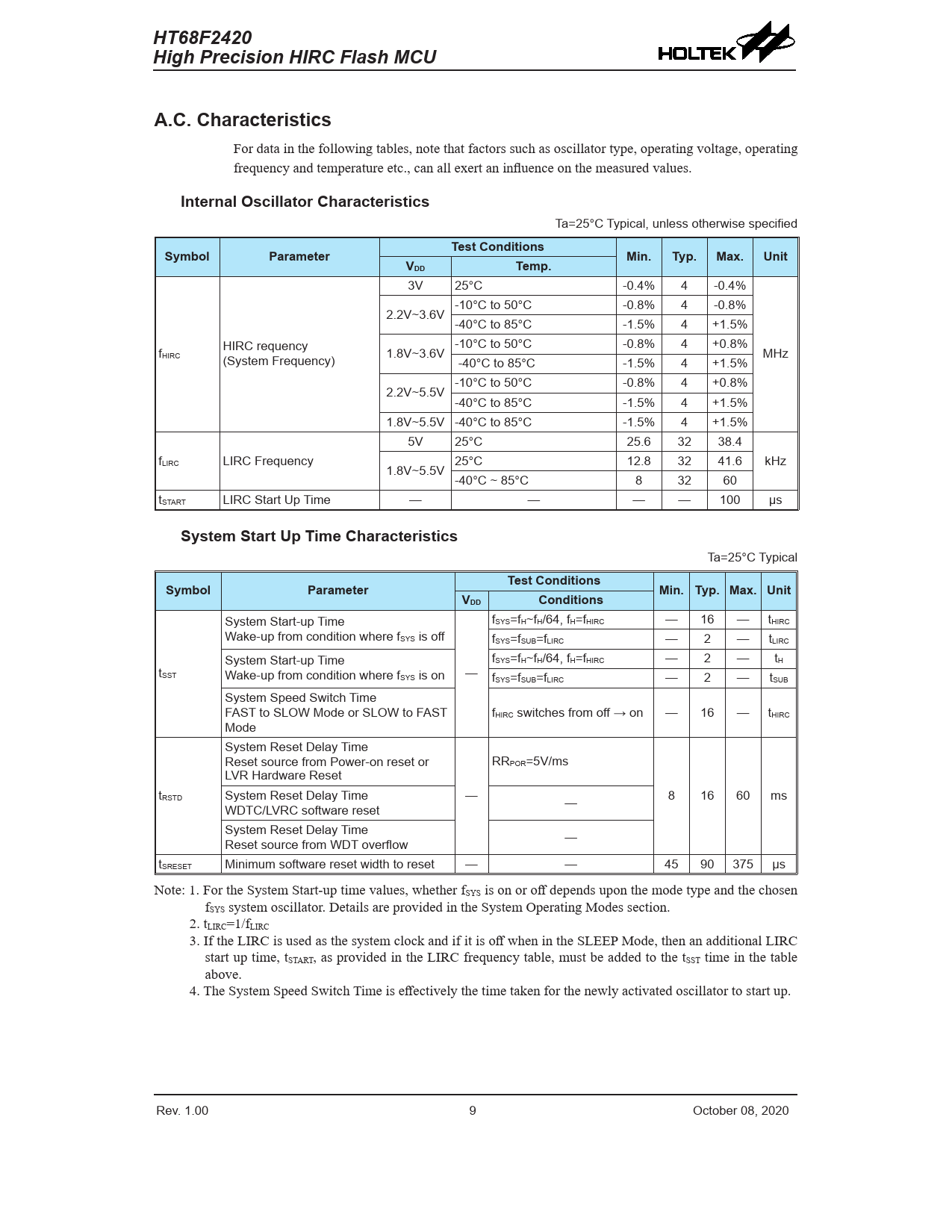 HT68F2420. High Precision HIRC Flash MCU. A.C. Characteristics. Internal Oscillator Characteristics. Test Conditions. Symbol