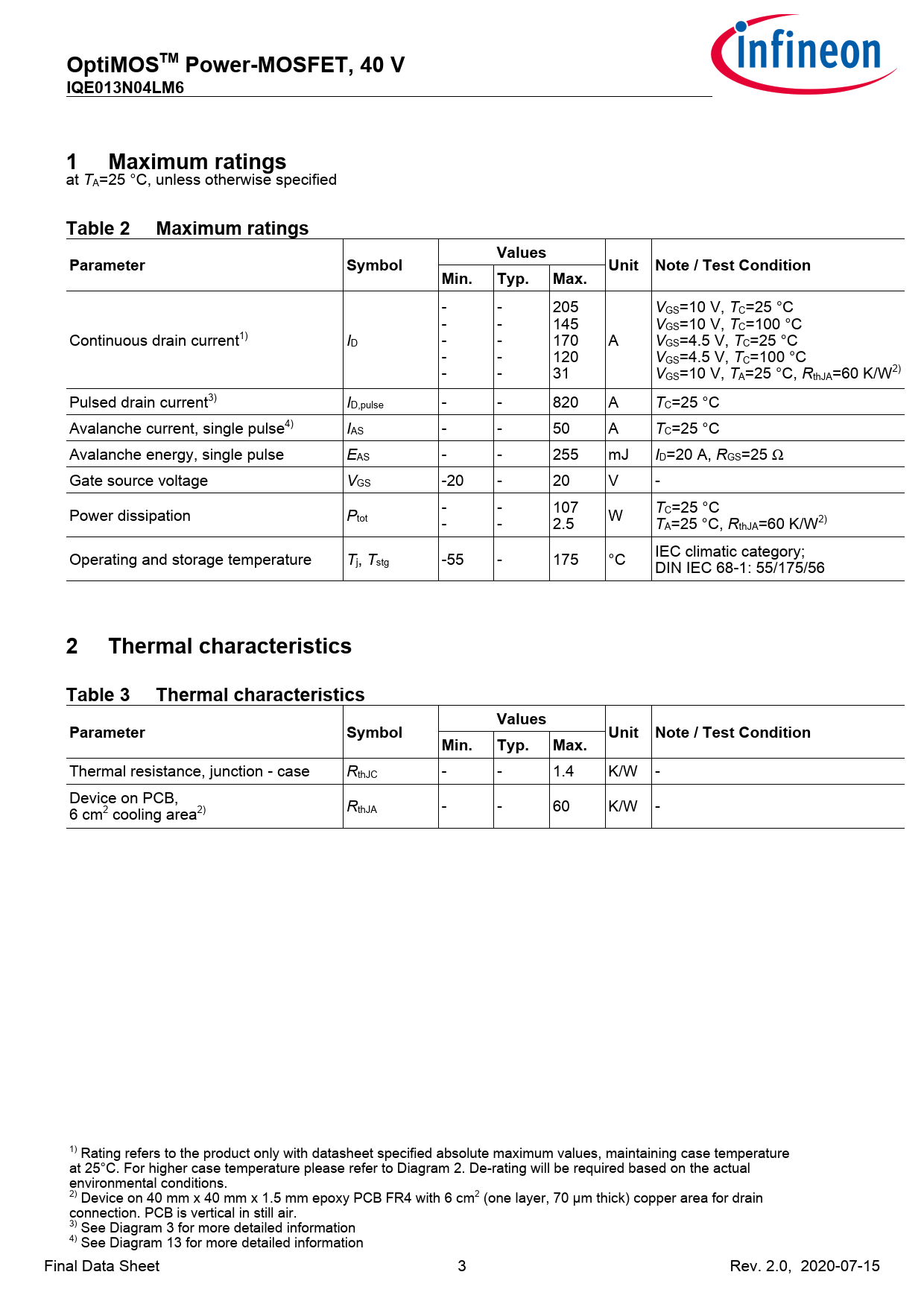 OptiMOSTMPower-MOSFET,40V IQE013N04LM6. 1Maximumratings. Table2Maximumratings. Values. Parameter. Symbol. Unit Note/TestCondition