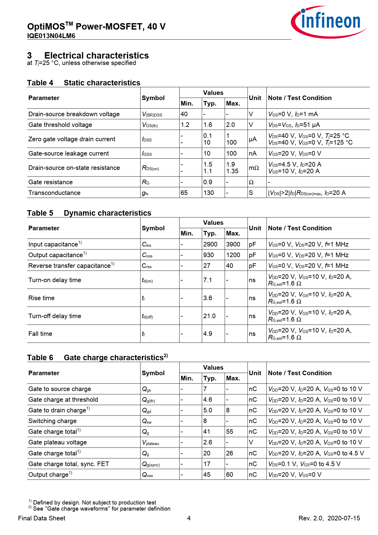 OptiMOSTMPower-MOSFET,40V IQE013N04LM6. 3Electricalcharacteristics. Table4Staticcharacteristics. Values. Parameter. Symbol