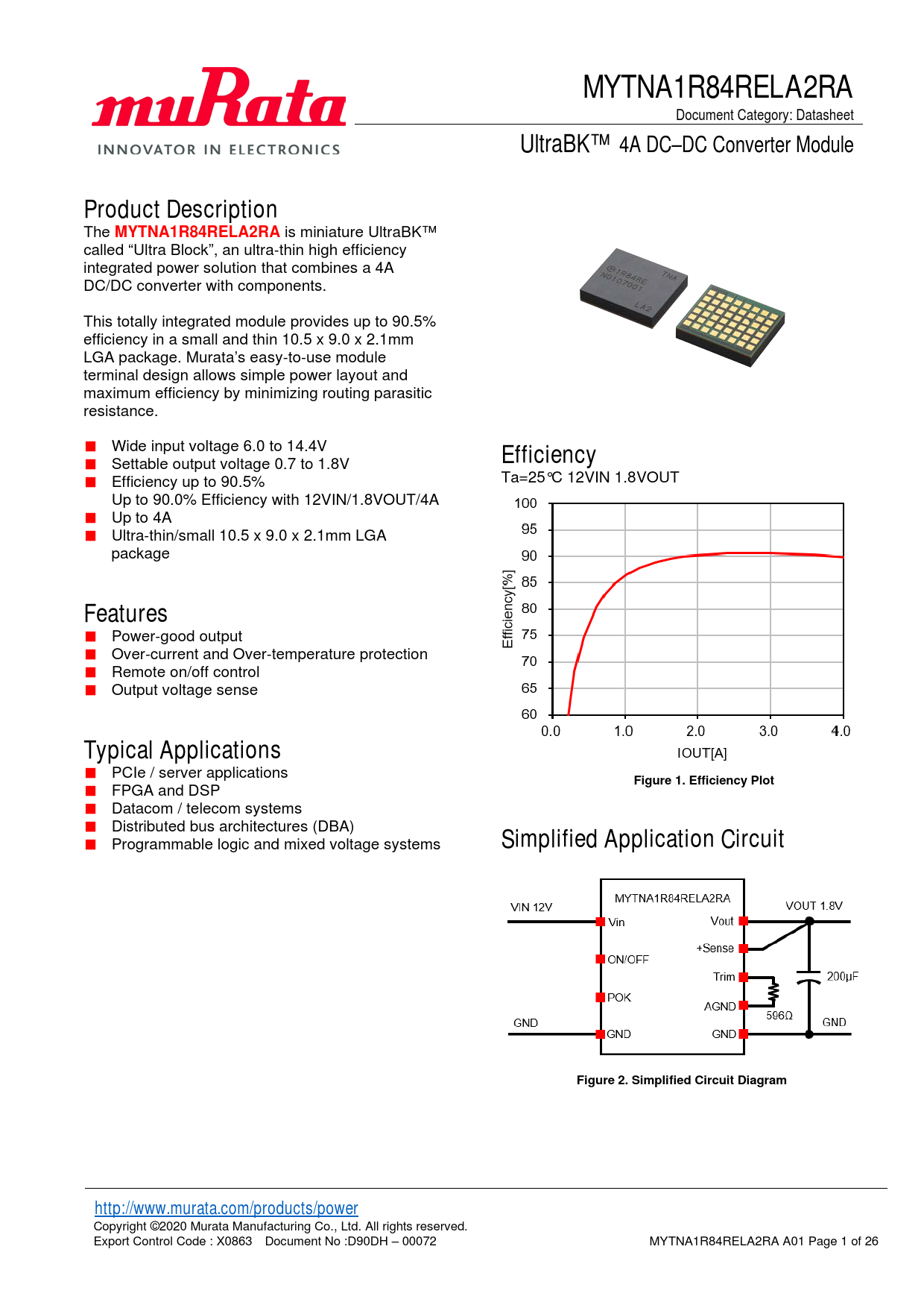 Copyright ©2020 Murata Manufacturing Co., Ltd. All rights reserved. Export Control Code : X0863 Document No :D90DH – 00072 MYTNA1R84RELA2RA A01 Page 1 of 26 Document Outline Product Description Features Typical Applications Efficiency Simplified Application Circuit Absolute Maximum Ratings(1)(2) Recommended Operating Conditions(1) Package Thermal Characteristics(1)(2) Electrical Characteristics Pin Configuration Pin Descriptions Functional Block Diagram Typical Performance Characteristics Thermal Deratings (Reference Data) Output Voltage Range Limitation of Input Voltage Slew rate Detailed Description Output Voltage Adjustment Resistor Trim Equation Output Voltage Remote Sense Function Remote Enable Function Soft start Function Power Good Operation Protections Over Current Protection and Short Circuit Protection Over Temperature Protection Soldering Guidelines Pb-free Solder Processes Dry Pack Information Application Performance Transient Performance Test Circuit Component Selection Input Fuse Input Capacitor Output Capacitor Packaging Information Moisture Sensitivity Level Package Drawing Recommended Board Land Pattern (Top View) Top Marking Specification Application Circuit Application Circuit Part List (Recommended) Application Board Example Tape and Reel Specification Order Codes Notices CAUTION Limitation of Applications Note Product Specification Sales contact Disclaimers Patent Statement Copyright and Trademark