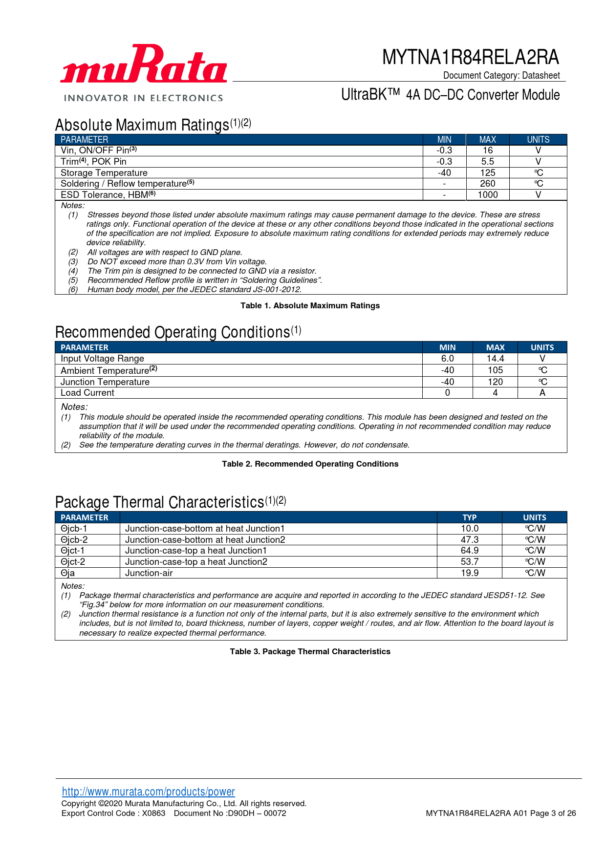Table 3. Package Thermal Characteristics http://www.murata.com/products/power
