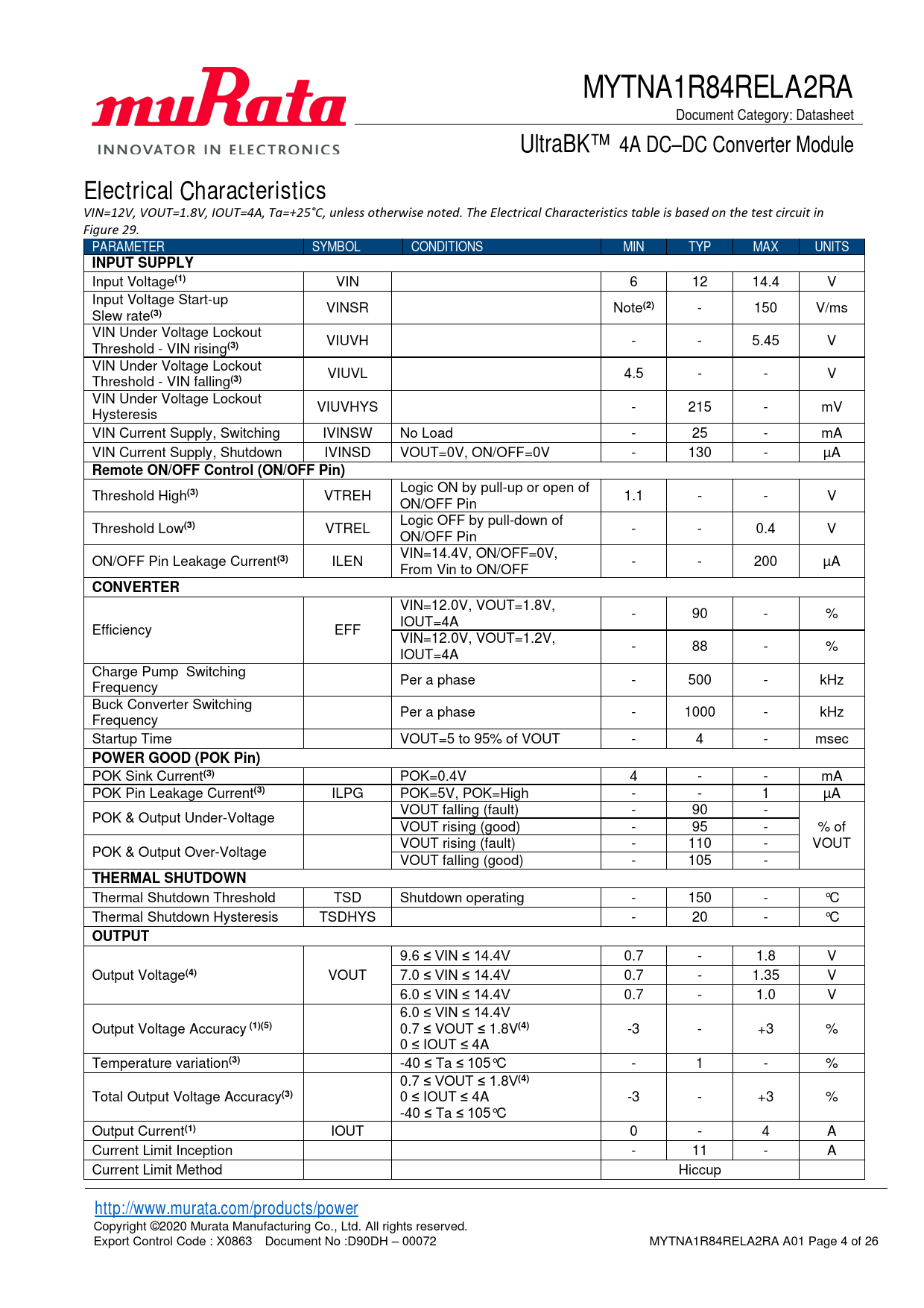 Copyright ©2020 Murata Manufacturing Co., Ltd. All rights reserved. Export Control Code : X0863 Document No :D90DH – 00072 MYTNA1R84RELA2RA A01 Page 4 of 26 Document Outline Product Description Features Typical Applications Efficiency Simplified Application Circuit Absolute Maximum Ratings(1)(2) Recommended Operating Conditions(1) Package Thermal Characteristics(1)(2) Electrical Characteristics Pin Configuration Pin Descriptions Functional Block Diagram Typical Performance Characteristics Thermal Deratings (Reference Data) Output Voltage Range Limitation of Input Voltage Slew rate Detailed Description Output Voltage Adjustment Resistor Trim Equation Output Voltage Remote Sense Function Remote Enable Function Soft start Function Power Good Operation Protections Over Current Protection and Short Circuit Protection Over Temperature Protection Soldering Guidelines Pb-free Solder Processes Dry Pack Information Application Performance Transient Performance Test Circuit Component Selection Input Fuse Input Capacitor Output Capacitor Packaging Information Moisture Sensitivity Level Package Drawing Recommended Board Land Pattern (Top View) Top Marking Specification Application Circuit Application Circuit Part List (Recommended) Application Board Example Tape and Reel Specification Order Codes Notices CAUTION Limitation of Applications Note Product Specification Sales contact Disclaimers Patent Statement Copyright and Trademark