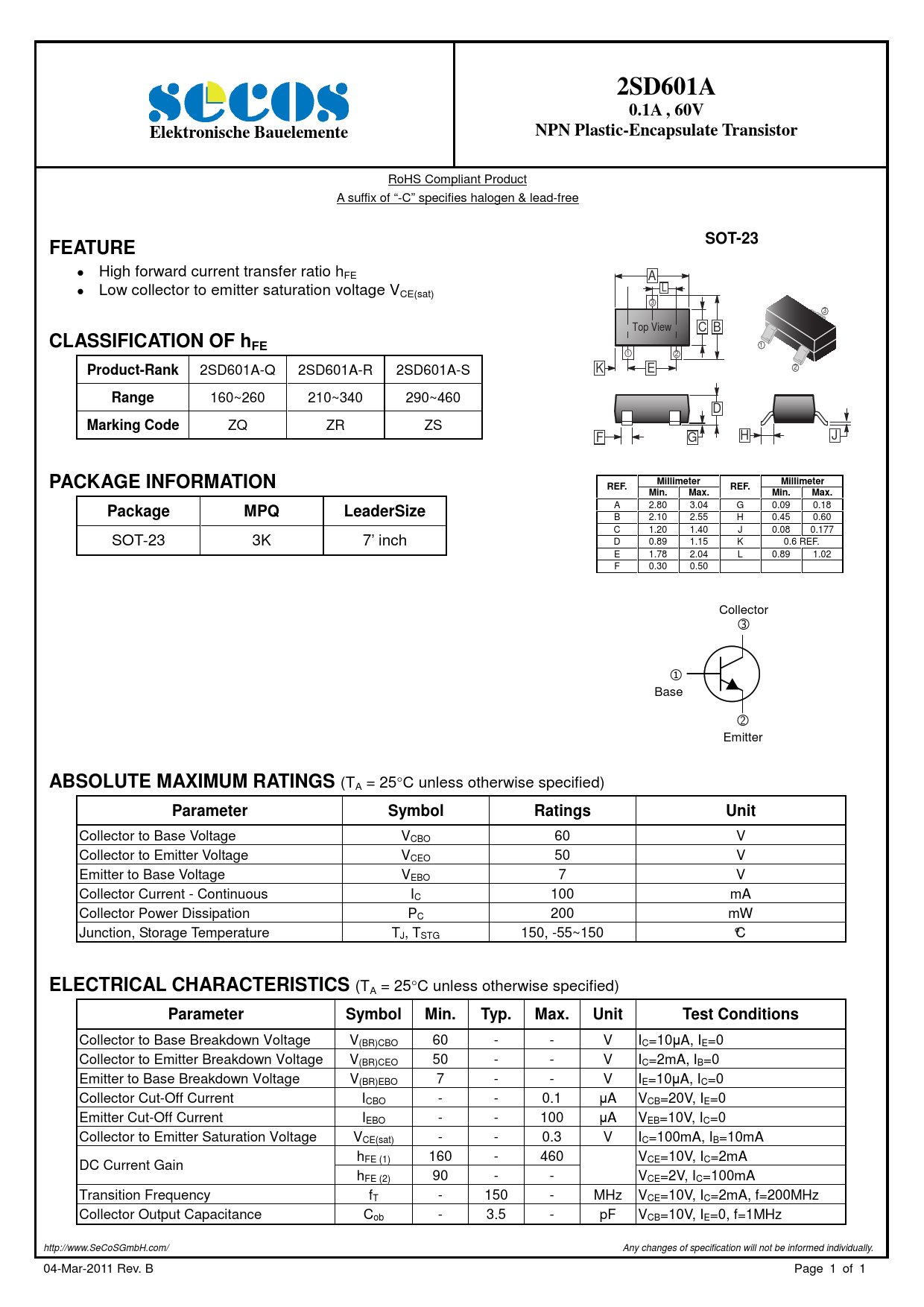 2SD601A0.1A , 60VElektronische BauelementeNPN Plastic-Encapsulate Transistor RoHS Compliant Product A suffix of “-C” specifies halogen & lead-free SOT-23FEATURE High forward current transfer ratio hFE A L Low collector to emitter saturation voltage VCE(sat) 3 3 Top View C B CLASSIFICATION OF hFE 1 1 2 Product-Rank 2SD601A-Q 2SD601A-R 2SD601A-S K E 2 Range 160~260 210~340 290~460 D Marking Code ZQ ZR ZS F G H J PACKAGE INFORMATIONMillimeterMillimeterREF.REF.Min.Max.Min.Max.PackageMPQLeaderSize A 2.80 3.04 G 0.09 0.18 B 2.10 2.55 H 0.45 0.60 C 1.20 1.40 J 0.08 0.177 SOT-23 3K 7’ inch D 0.89 1.15 K 0.6 REF. E 1.78 2.04 L 0.89 1.02 F 0.30 0.50 Collector 3 1 Base 2 Emitter ABSOLUTE MAXIMUM RATINGS (TA = 25°C unless otherwise specified) ParameterSymbolRatingsUnit Collector to Base Voltage VCBO 60 V Collector to Emitter Voltage VCEO 50 V Emitter to Base Voltage VEBO 7 V Collector Current - Continuous IC 100 mA Collector Power Dissipation PC 200 mW Junction, Storage Temperature TJ, TSTG 150, -55~150 °C ELECTRICAL CHARACTERISTICS (TA = 25°C unless otherwise specified) ParameterSymbolMin.Typ.Max.UnitTest Conditions Collector to Base Breakdown Voltage V(BR)CBO 60 - - V IC=10µA, IE=0 Collector to Emitter Breakdown Voltage V(BR)CEO 50 - - V IC=2mA, IB=0 Emitter to Base Breakdown Voltage V(BR)EBO 7 - - V IE=10µA, IC=0 Collector Cut-Off Current ICBO - - 0.1 µA VCB=20V, IE=0 Emitter Cut-Off Current IEBO - - 100 µA VEB=10V, IC=0 Collector to Emitter Saturation Voltage VCE(sat) - - 0.3 V IC=100mA, IB=10mA hFE (1) 160 - 460 VCE=10V, IC=2mA DC Current Gain hFE (2) 90 - - VCE=2V, IC=100mA Transition Frequency fT - 150 - MHz VCE=10V, IC=2mA, f=200MHz Collector Output Capacitance Cob - 3.5 - pF VCB=10V, IE=0, f=1MHz http://www.SeCoSGmbH.com/ Any changes of specification will not be informed individually. 04-Mar-2011 Rev. B Page 1 of 1