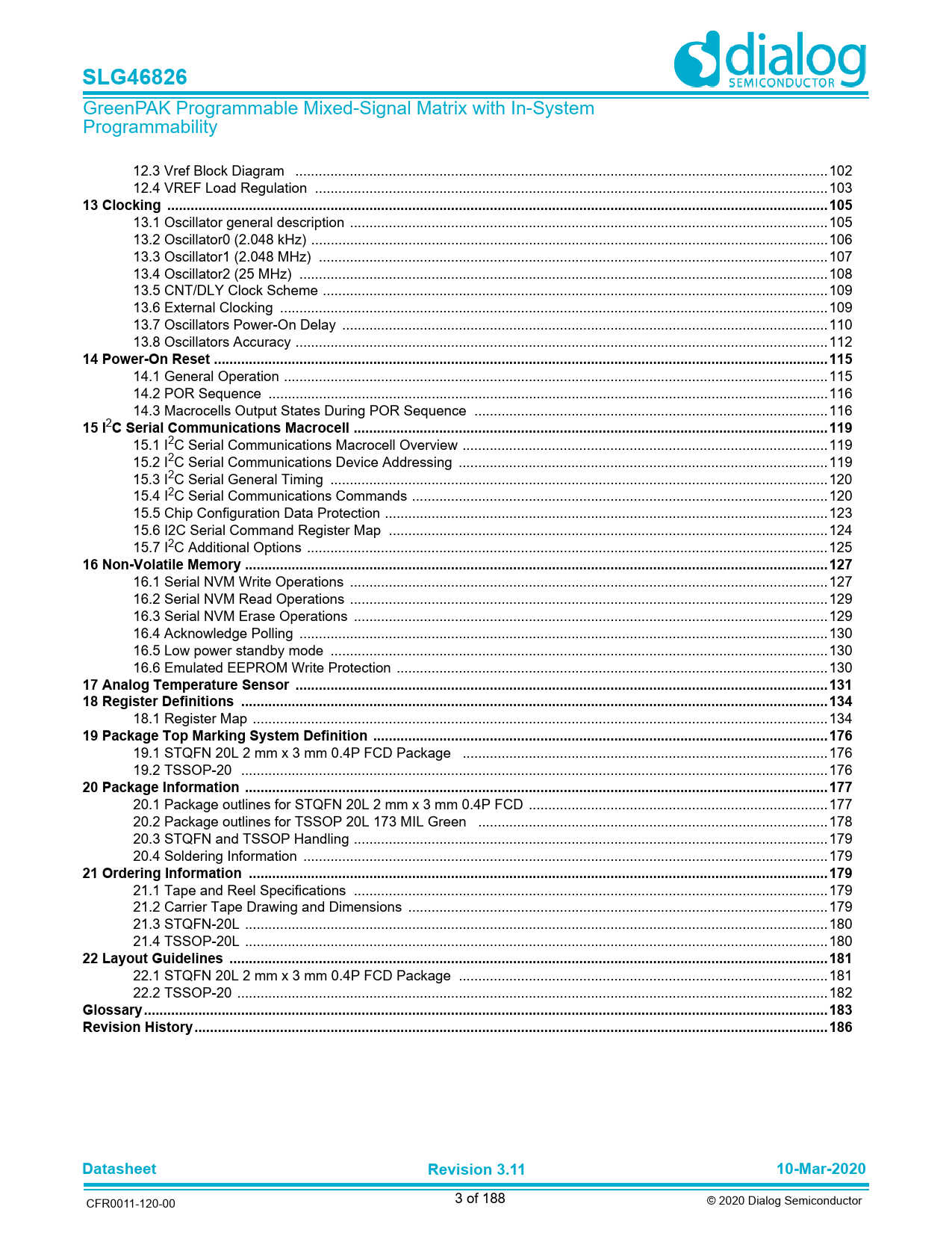 | Páginas / Página | 188 / 3 — SLG46826. 13 Clocking .. 105. 14 Power-On Reset .. 115. 15 I. C Serial … |