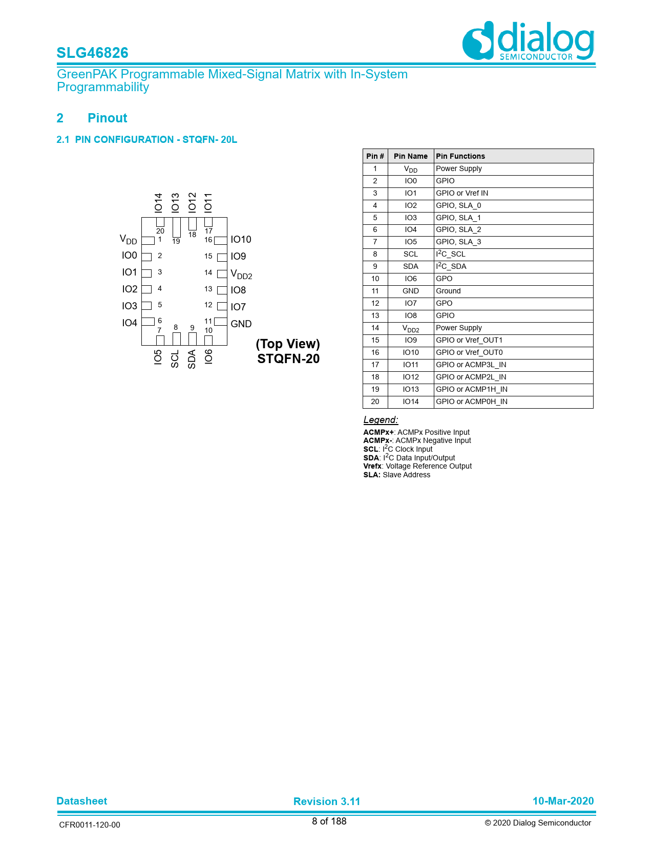 SLG46826. Pinout. 2.1 PIN CONFIGURATION - STQFN- 20L. Pin #. Pin Name. Pin Functions. (Top View). STQFN-20. ACMPx+. ACMPx-. SCL. SDA. Vrefx. SLA: