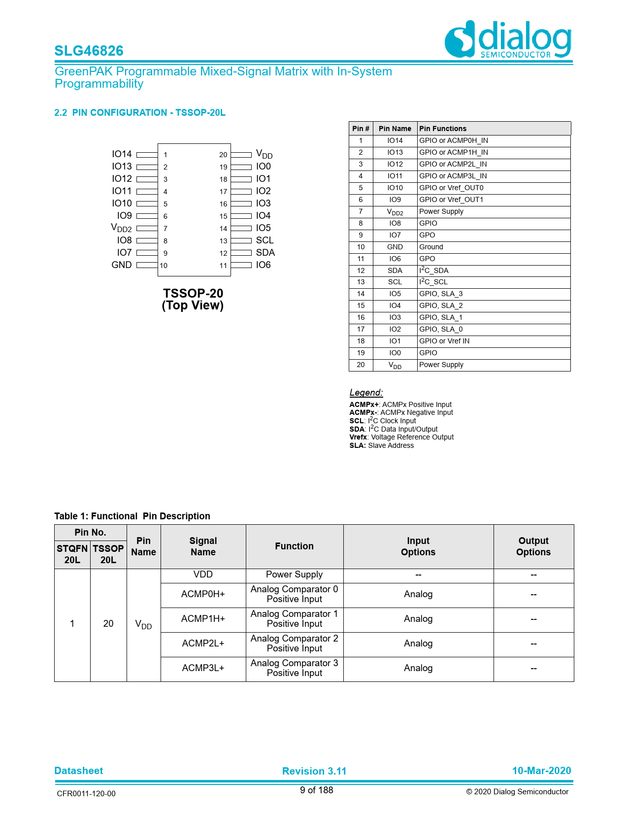 SLG46826. 2.2 PIN CONFIGURATION - TSSOP-20L. Pin #. Pin Name. Pin Functions. TSSOP-20. (Top View). ACMPx+. ACMPx-. SCL. SDA. Vrefx. SLA: