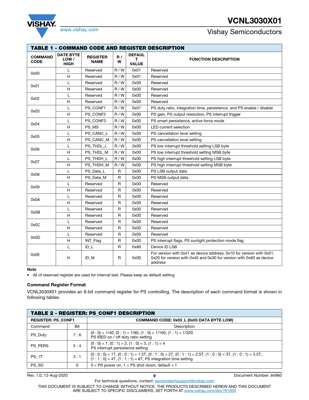 VCNL3030X01 TABLE 1 - COMMAND CODE AND REGISTER DESCRIPTION DATE BYTE DEFAUL COMMAND REGISTER R / LOW / FUNCTION DESCRIPTION