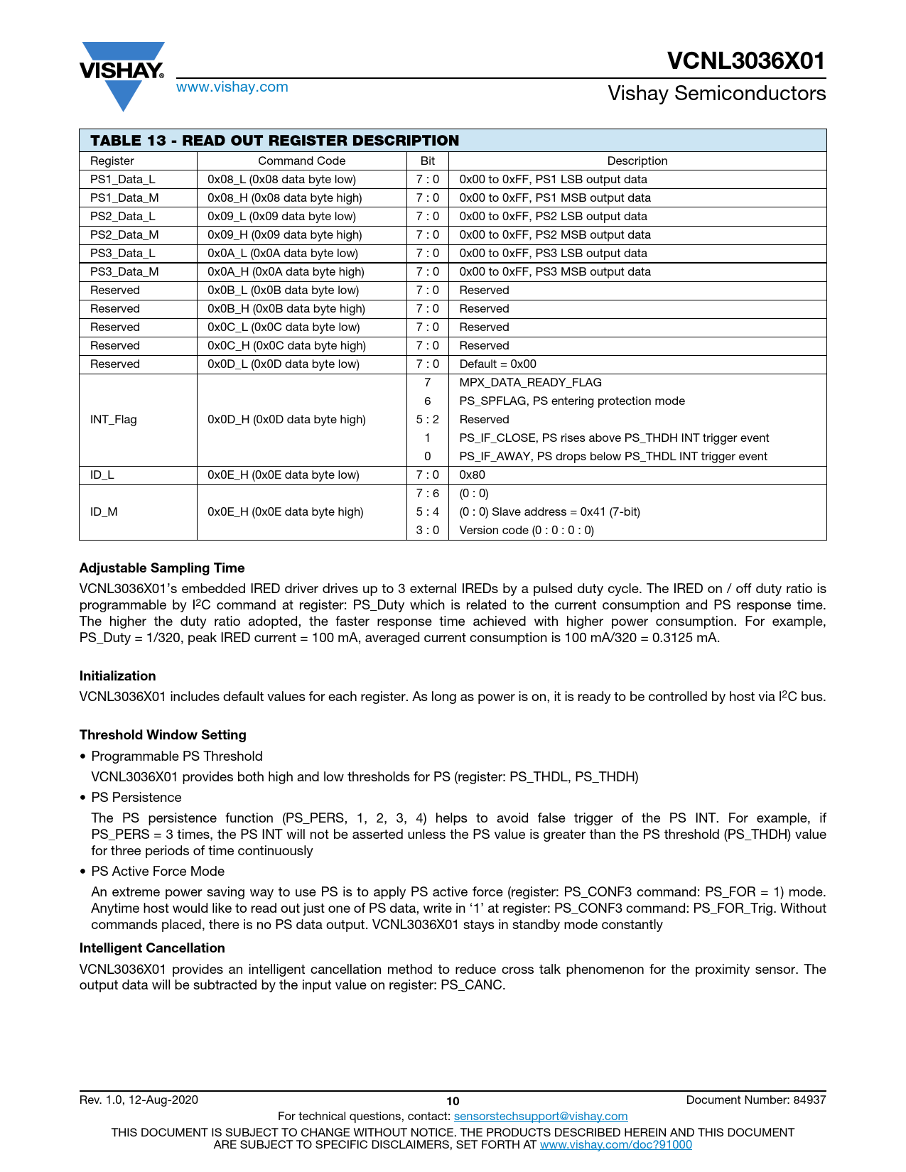 Páginas / Página16 / 10 — VCNL3036X01. TABLE 13 - READ OUT REGISTER DESCRIPTION. Adjustable …
