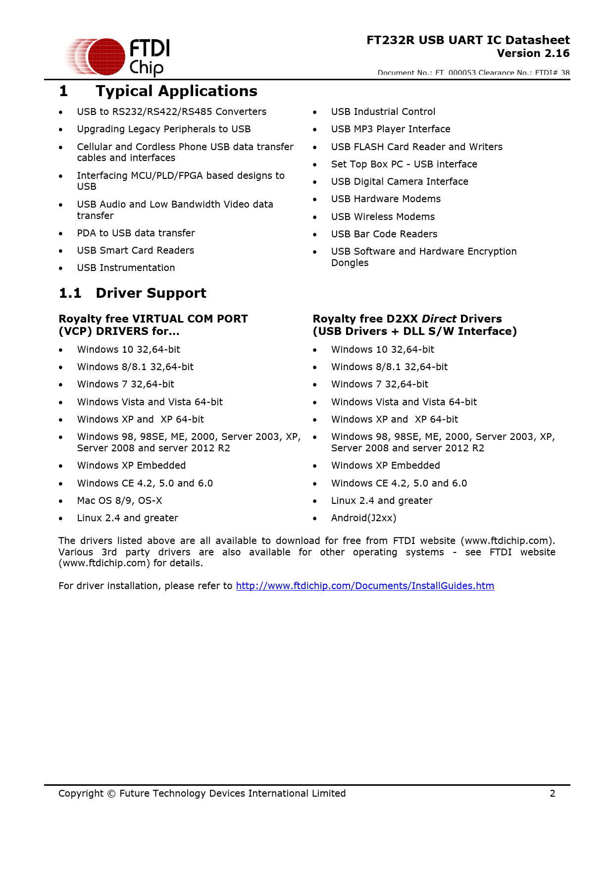 FT232R USB UART IC Datasheet. Version 2.16. Typical Applications. 1.1 Driver Support. Royalty free VIRTUAL COM PORT