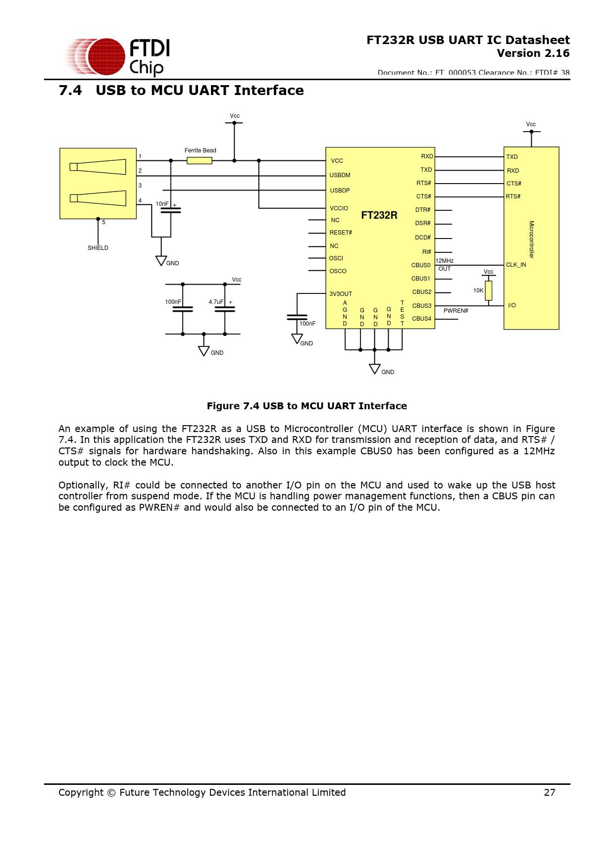 FT232R USB UART IC Datasheet. Version 2.16. 7.4 USB to MCU UART Interface. FT232R. Figure 7.4 USB to MCU UART Interface