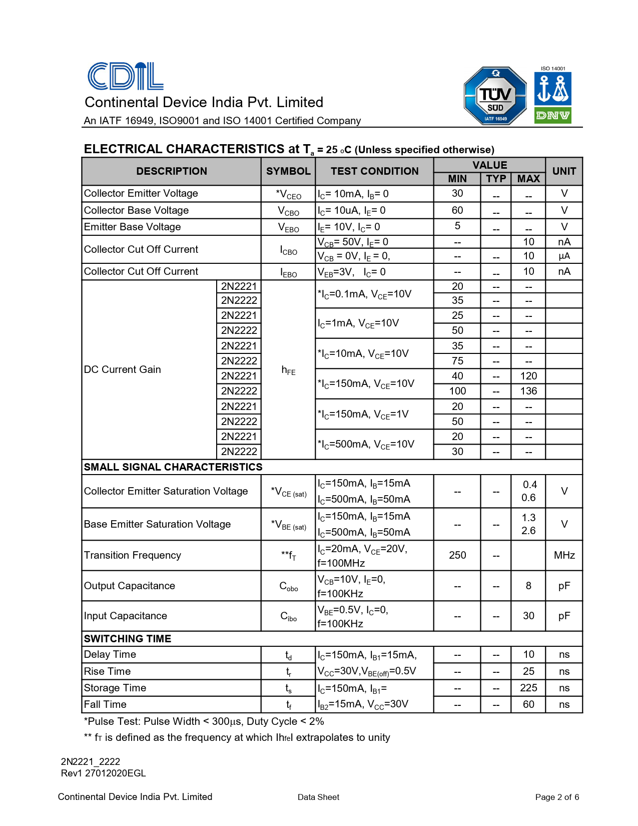 Continental Device India Pvt. Limited An IATF 16949, ISO9001 and ISO 14001 Certified Company ELECTRICAL CHARACTERISTICS at Ta = 25 OC (Unless specified otherwise) VALUE DESCRIPTION SYMBOL TEST CONDITION UNIT MIN TYP MAX Col ector Emitter Voltage *VCEO IC= 10mA, IB= 0 30 -- -- V Col ector Base Voltage VCBO IC= 10uA, IE= 0 60 -- -- V Emitter Base Voltage VEBO IE= 10V, IC= 0 5 -- -- V V Col ector Cut Off Current I CB= 50V, IE= 0 -- 10 nA CBO VCB = 0V, IE = 0, -- -- 10 µA Col ector Cut Off Current IEBO VEB=3V, IC= 0 -- -- 10 nA 2N2221 20 -- -- *IC=0.1mA, VCE=10V 2N2222 35 -- -- 2N2221 25 -- -- IC=1mA, VCE=10V 2N2222 50 -- -- 2N2221 35 -- -- *IC=10mA, VCE=10V 2N2222 75 -- -- DC Current Gain hFE 2N2221 40 -- 120 *IC=150mA, VCE=10V 2N2222 100 -- 136 2N2221 20 -- -- *IC=150mA, VCE=1V 2N2222 50 -- -- 2N2221 20 -- -- *IC=500mA, VCE=10V 2N2222 30 -- -- SMALL SIGNAL CHARACTERISTICS I 0.4 Col ector Emitter Saturation Voltage *V C=150mA, IB=15mA CE (sat) -- -- V I 0.6 C=500mA, IB=50mA I 1.3 Base Emitter Saturation Voltage *V C=150mA, IB=15mA BE (sat) -- -- V I 2.6 C=500mA, IB=50mA I Transition Frequency **f C=20mA, VCE=20V, T 250 -- MHz f=100MHz V Output Capacitance C CB=10V, IE=0, obo -- -- 8 pF f=100KHz V Input Capacitance C BE=0.5V, IC=0, ibo -- -- 30 pF f=100KHz SWITCHING TIME Delay Time td I -- -- 10 ns C=150mA, IB1=15mA, Rise Time t V r CC=30V,VBE(off)=0.5V -- -- 25 ns Storage Time ts I -- -- 225 ns C=150mA, IB1= Fal Time t I f B2=15mA, VCC=30V -- -- 60 ns *Pulse Test: Pulse Width < 300ms, Duty Cycle < 2% ** fT is defined as the frequency at which IhfeI extrapolates to unity 2N2221_2222 Rev1 27012020EGL Continental Device India Pvt. Limited Data Sheet Page 2 of 6