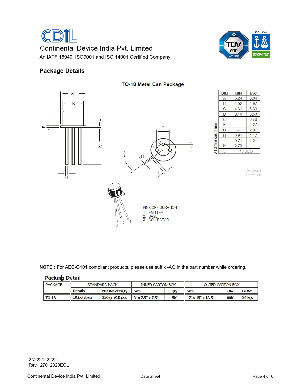 Continental Device India Pvt. Limited An IATF 16949, ISO9001 and ISO 14001 Certified Company Package Details NOTE : For AEC-Q101 compliant products, please use suffix -AQ in the part number while ordering. 2N2221_2222 Rev1 27012020EGL Continental Device India Pvt. Limited Data Sheet Page 4 of 6
