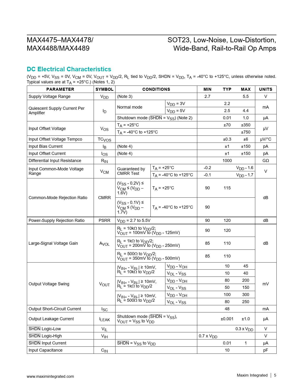 MAX4475–MAX4478/ SOT23, Low-Noise, Low-Distortion, MAX4488/MAX4489 Wide-Band, Rail-to-Rail Op Amps DC Electrical Characteristics (VDD = +5V, VSS = 0V, VCM = 0V, VOUT = VDD/2, RL tied to VDD/2, SHDN = VDD, TA = -40°C to +125°C, unless otherwise noted. Typical values are at TA = +25°C.) (Notes 1, 2) PARAMETERSYMBOLCONDITIONSMINTYPMAXUNITS Supply Voltage Range VDD (Note 3) 2.7 5.5 V VDD = 3V 2.2 Quiescent Supply Current Per Normal mode mA Amplifier ID VDD = 5V 2.5 4.4 Shutdown mode (SHDN = VSS) (Note 2) 0.01 1.0 µA T Input Offset Voltage V A = +25°C ±70 ±350 OS µV TA = -40°C to +125°C ±750 Input Offset Voltage Tempco TCVOS ±0.3 ±6 µV/°C Input Bias Current IB (Note 4) ±1 ±150 pA Input Offset Current IOS (Note 4) ±1 ±150 pA Differential Input Resistance RIN 1000 GΩ Input Common-Mode Voltage Guaranteed by TA = +25°C -0.2 VDD - 1.6 Range VCM CMRR Test V TA = -40°C to +125°C -0.1 VDD - 1.7 (VSS - 0.2V) ≤ VCM ≤ (VDD – TA = +25°C 90 115 1.6V) Common-Mode Rejection Ratio CMRR dB (VSS - 0.1V) ≤ VCM ≤ (VDD – TA = -40°C to +125°C 90 1.7V) Power-Supply Rejection Ratio PSRR VDD = 2.7 to 5.5V 90 120 dB RL = 10kΩ to VDD/2; VOUT = 100mV to (VDD - 125mV) 90 120 Large-Signal Voltage Gain A R VOL L = 1kΩ to VDD/2; dB VOUT = 200mV to (VDD - 250mV) 85 110 RL = 500Ω to VDD/2; VOUT = 350mV to (VDD - 500mV) 85 110 |VIN+ - VIN-| ≥ 10mV, VDD - VOH 10 45 RL = 10kΩ to VDD/2 VOL - VSS 10 40 V Output Voltage Swing V |V DD - VOH 80 200 OUT IN+ - VIN-| ≥ 10mV, mV RL = 1kΩ to VDD/2 VOL - VSS 50 150 |VIN+ - VIN-| ≥ 10mV, VDD - VOH 100 300 RL = 500Ω to VDD/2 VOL - VSS 80 250 Output Short-Circuit Current ISC 48 mA Output Leakage Current I Shutdown mode (SHDN = V LEAK SS), V ±0.001 ±1.0 µA OUT = VSS to VDD SHDN Logic-Low VIL 0.3 x VDD V SHDN Logic-High VIH 0.7 x VDD V SHDN Input Current SHDN = VSS to VDD 0.01 1 µA Input Capacitance CIN 10 pF www.maximintegrated.com Maxim Integrated │ 5