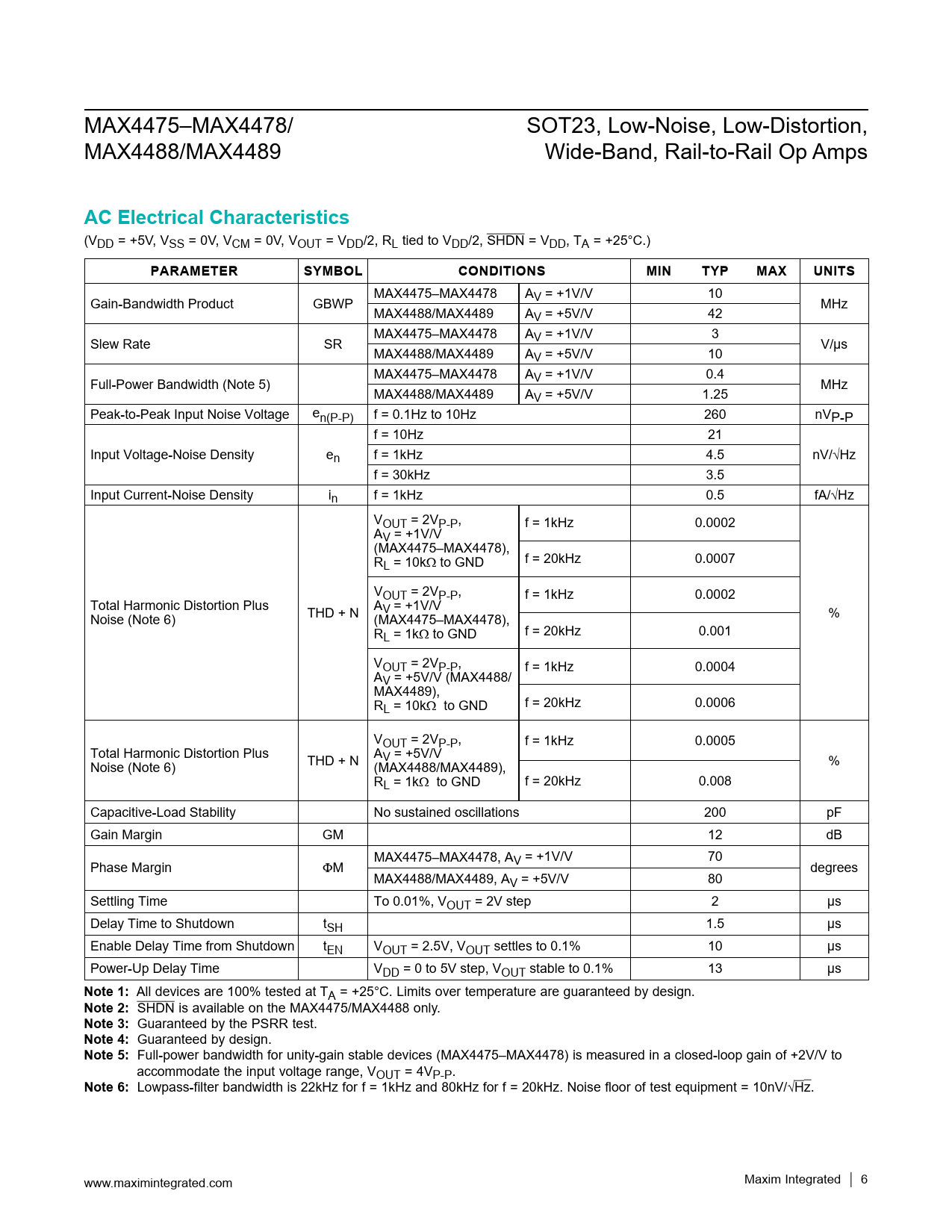 MAX4475–MAX4478/ SOT23, Low-Noise, Low-Distortion, MAX4488/MAX4489 Wide-Band, Rail-to-Rail Op Amps AC Electrical Characteristics (VDD = +5V, VSS = 0V, VCM = 0V, VOUT = VDD/2, RL tied to VDD/2, SHDN = VDD, TA = +25°C.) PARAMETERSYMBOLCONDITIONSMINTYPMAXUNITS MAX4475–MAX4478 A Gain-Bandwidth Product GBWP V = +1V/V 10 MHz MAX4488/MAX4489 AV = +5V/V 42 MAX4475–MAX4478 A Slew Rate SR V = +1V/V 3 V/µs MAX4488/MAX4489 AV = +5V/V 10 MAX4475–MAX4478 A Full-Power Bandwidth (Note 5) V = +1V/V 0.4 MHz MAX4488/MAX4489 AV = +5V/V 1.25 Peak-to-Peak Input Noise Voltage en(P-P) f = 0.1Hz to 10Hz 260 nVP-P f = 10Hz 21 Input Voltage-Noise Density en f = 1kHz 4.5 nV/√Hz f = 30kHz 3.5 Input Current-Noise Density in f = 1kHz 0.5 fA/√Hz VOUT = 2VP-P, f = 1kHz 0.0002 AV = +1V/V (MAX4475–MAX4478), RL = 10kΩ to GND f = 20kHz 0.0007 VOUT = 2VP-P, f = 1kHz 0.0002 Total Harmonic Distortion Plus AV = +1V/V Noise (Note 6) THD + N % (MAX4475–MAX4478), RL = 1kΩ to GND f = 20kHz 0.001 VOUT = 2VP-P, f = 1kHz 0.0004 AV = +5V/V (MAX4488/ MAX4489), RL = 10kΩ to GND f = 20kHz 0.0006 VOUT = 2VP-P, f = 1kHz 0.0005 Total Harmonic Distortion Plus AV = +5V/V Noise (Note 6) THD + N (MAX4488/MAX4489), % RL = 1kΩ to GND f = 20kHz 0.008 Capacitive-Load Stability No sustained oscillations 200 pF Gain Margin GM 12 dB MAX4475–MAX4478, A Phase Margin FM V = +1V/V 70 degrees MAX4488/MAX4489, AV = +5V/V 80 Settling Time To 0.01%, VOUT = 2V step 2 µs Delay Time to Shutdown tSH 1.5 µs Enable Delay Time from Shutdown tEN VOUT = 2.5V, VOUT settles to 0.1% 10 µs Power-Up Delay Time VDD = 0 to 5V step, VOUT stable to 0.1% 13 µs Note 1: All devices are 100% tested at TA = +25°C. Limits over temperature are guaranteed by design. Note 2: SHDN is available on the MAX4475/MAX4488 only. Note 3: Guaranteed by the PSRR test. Note 4: Guaranteed by design. Note 5: Full-power bandwidth for unity-gain stable devices (MAX4475–MAX4478) is measured in a closed-loop gain of +2V/V to accommodate the input voltage range, VOUT = 4VP-P. Note 6: Lowpass-filter bandwidth is 22kHz for f = 1kHz and 80kHz for f = 20kHz. Noise floor of test equipment = 10nV/√Hz. www.maximintegrated.com Maxim Integrated │ 6