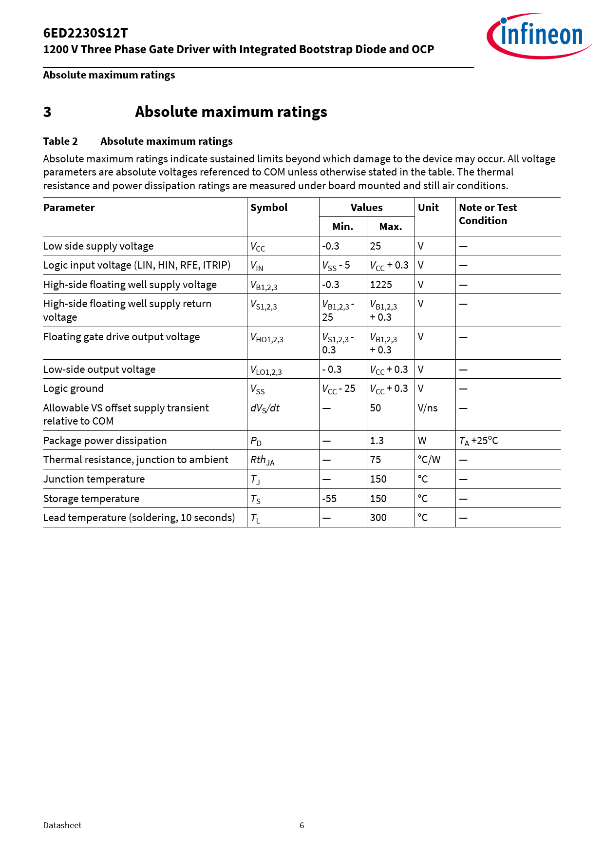 6ED2230S12T. 1200 V Three Phase Gate Driver with Integrated Bootstrap Diode and OCP. Absolute maximum ratings. Table 2