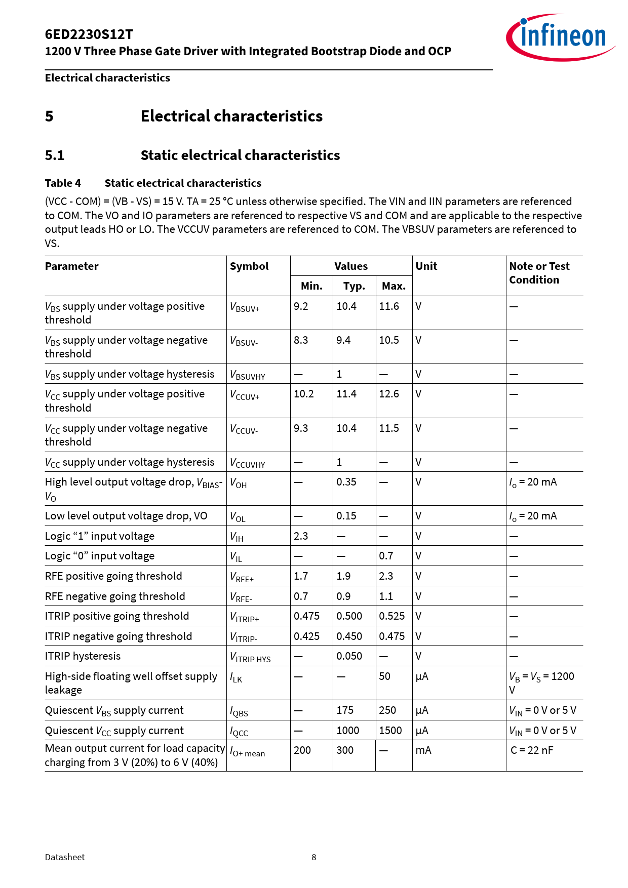 6ED2230S12T. 1200 V Three Phase Gate Driver with Integrated Bootstrap Diode and OCP. Electrical characteristics. 5.1