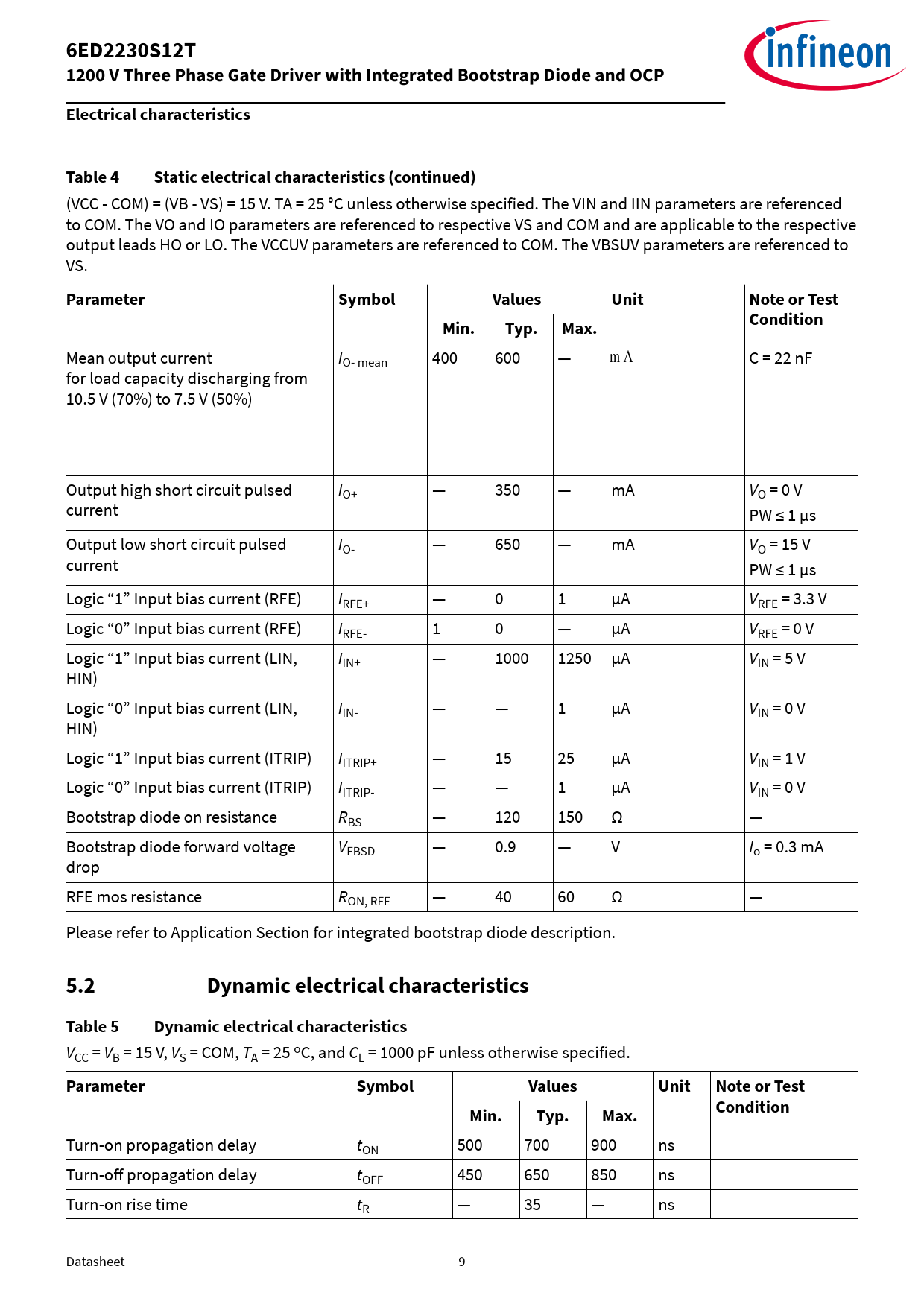 6ED2230S12T. 1200 V Three Phase Gate Driver with Integrated Bootstrap Diode and OCP. Electrical characteristics. Table 4