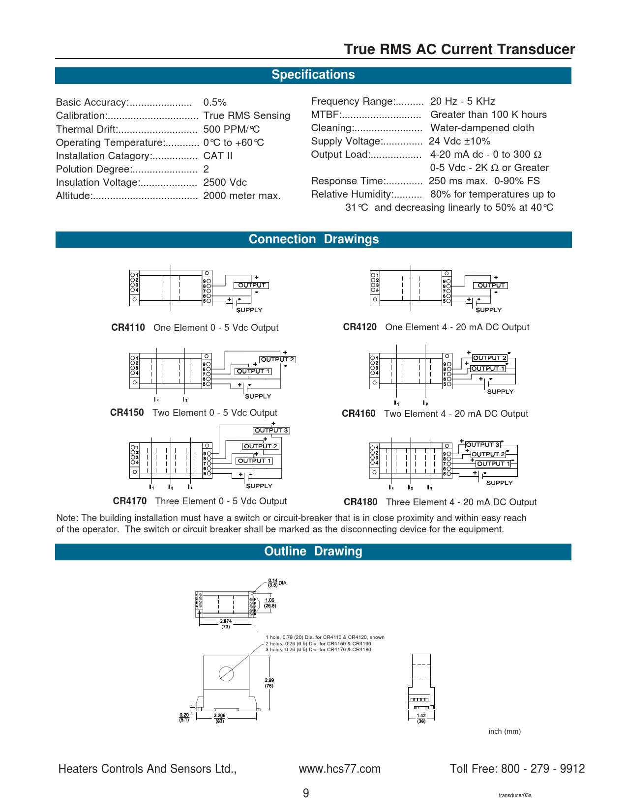 True RMS AC Current TransducerSpecifications Basic Accuracy:.. 0.5% Frequency Range:.. 20 Hz - 5 KHz Calibration:.. True RMS Sensing MTBF:.. Greater than 100 K hours Thermal Drift:.. 500 PPM/°C Cleaning:.. Water-dampened cloth Operating Temperature:.. 0°C to +60°C Supply Voltage:.. 24 Vdc ±10% Installation Catagory:.. CAT II Output Load:.. 4-20 mA dc - 0 to 300 Ω Polution Degree:... 2 0-5 Vdc - 2K Ω or Greater Insulation Voltage:.. 2500 Vdc Response Time:... 250 ms max. 0-90% FS Altitude:... 2000 meter max. Relative Humidity:.. 80% for temperatures up to 31°C and decreasing linearly to 50% at 40°C Connection DrawingsCR4110 One Element 0 - 5 Vdc Output CR4120 One Element 4 - 20 mA DC Output CR4150 Two Element 0 - 5 Vdc Output CR4160 Two Element 4 - 20 mA DC Output CR4170 Three Element 0 - 5 Vdc Output CR4180 Three Element 4 - 20 mA DC Output Note: The building installation must have a switch or circuit-breaker that is in close proximity and within easy reach of the operator. The switch or circuit breaker shall be marked as the disconnecting device for the equipment. Outline Drawing 1 hole, 0.79 (20) Dia. for CR4110 & CR4120, shown 2 holes, 0.26 (6.5) Dia. for CR4150 & CR4160 3 holes, 0.26 (6.5) Dia. for CR4170 & CR4180 inch (mm) Heaters Controls And Sensors Ltd., www.hcs77.com Toll Free: 800 - 279 - 9912 9 transducer03a