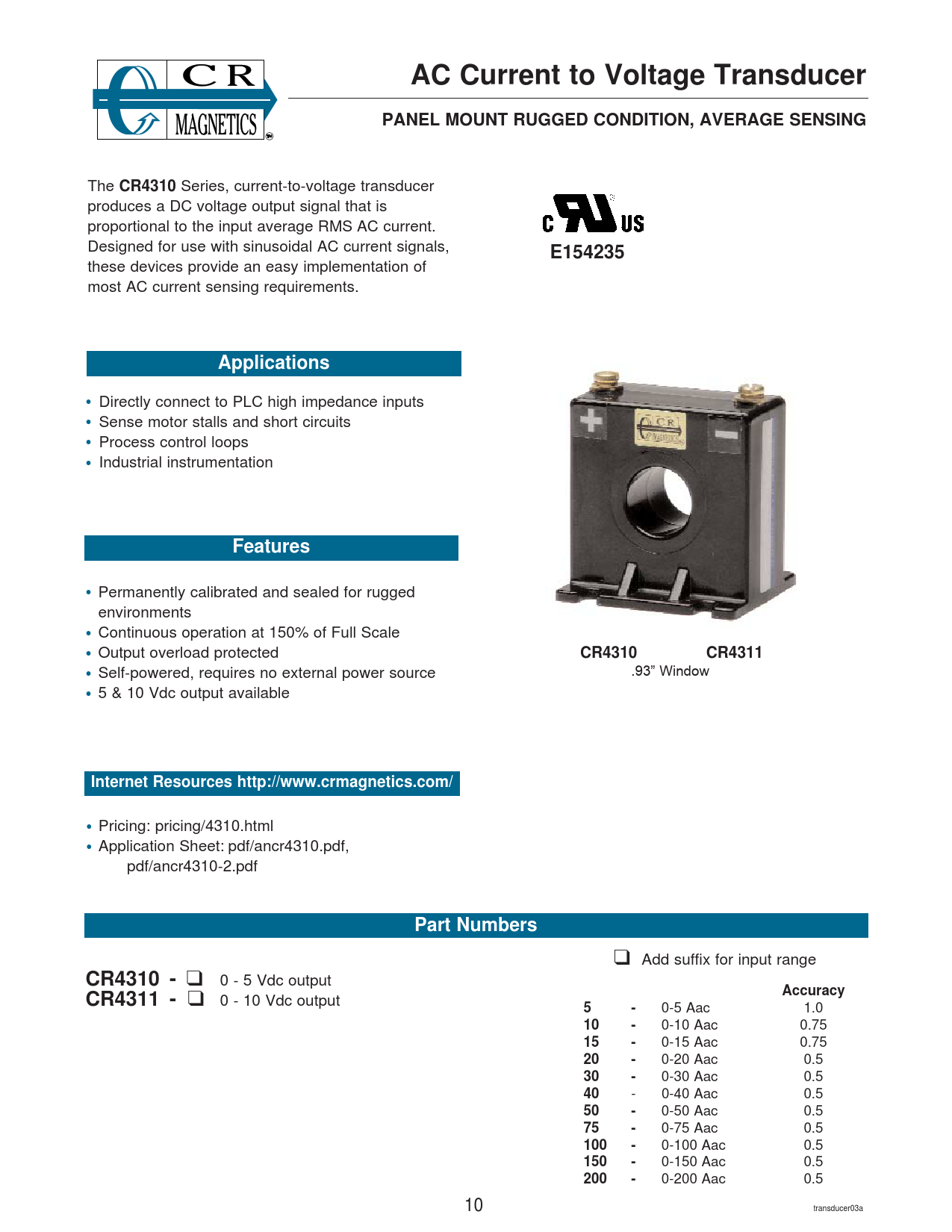 AC Current to Voltage Transducer. PANEL MOUNT RUGGED CONDITION, AVERAGE SENSING. CR4310. E154235. Applications. Features. CR4311
