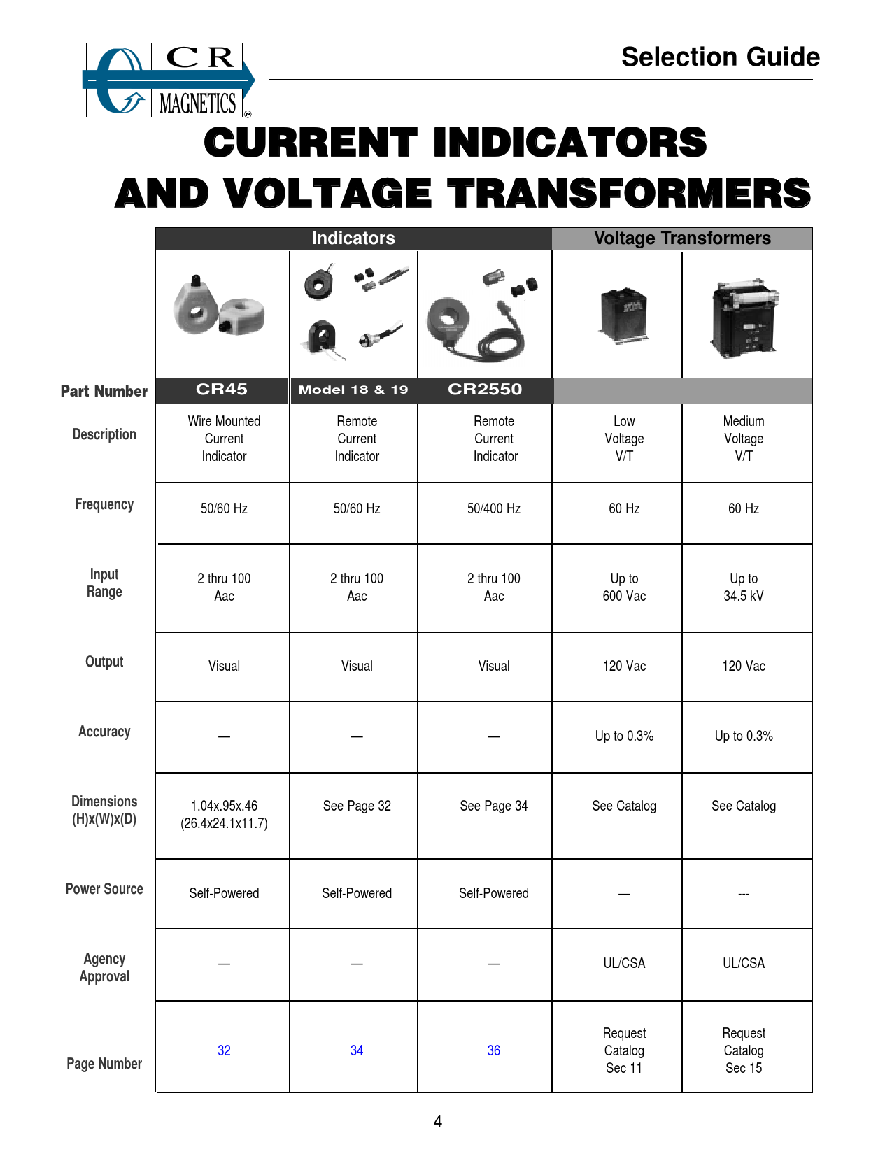 link to page 33 link to page 35 link to page 37 link to page 33 link to page 35 link to page 37 Selection GuideCURRENT INDICATORSAND VOLTAGE TRANSFORMERSIndicatorsVoltage TransformersPart NumberCR45Model 18 & 19CR2550 Wire Mounted Remote Remote Low Medium Description Current Current Current Voltage Voltage Indicator Indicator Indicator V/T V/T Frequency 50/60 Hz 50/60 Hz 50/400 Hz 60 Hz 60 Hz Input 2 thru 100 2 thru 100 2 thru 100 Up to Up to Range Aac Aac Aac 600 Vac 34.5 kV Output Visual Visual Visual 120 Vac 120 Vac Accuracy — — — Up to 0.3% Up to 0.3% Dimensions 1.04x.95x.46 See Page 32 See Page 34 See Catalog See Catalog (H)x(W)x(D) (26.4x24.1x11.7) Power Source Self-Powered Self-Powered Self-Powered — --- Agency — — — UL/CSA UL/CSA Approval Request Request 32 34 36 Catalog Catalog Page Number Sec 11 Sec 15 4