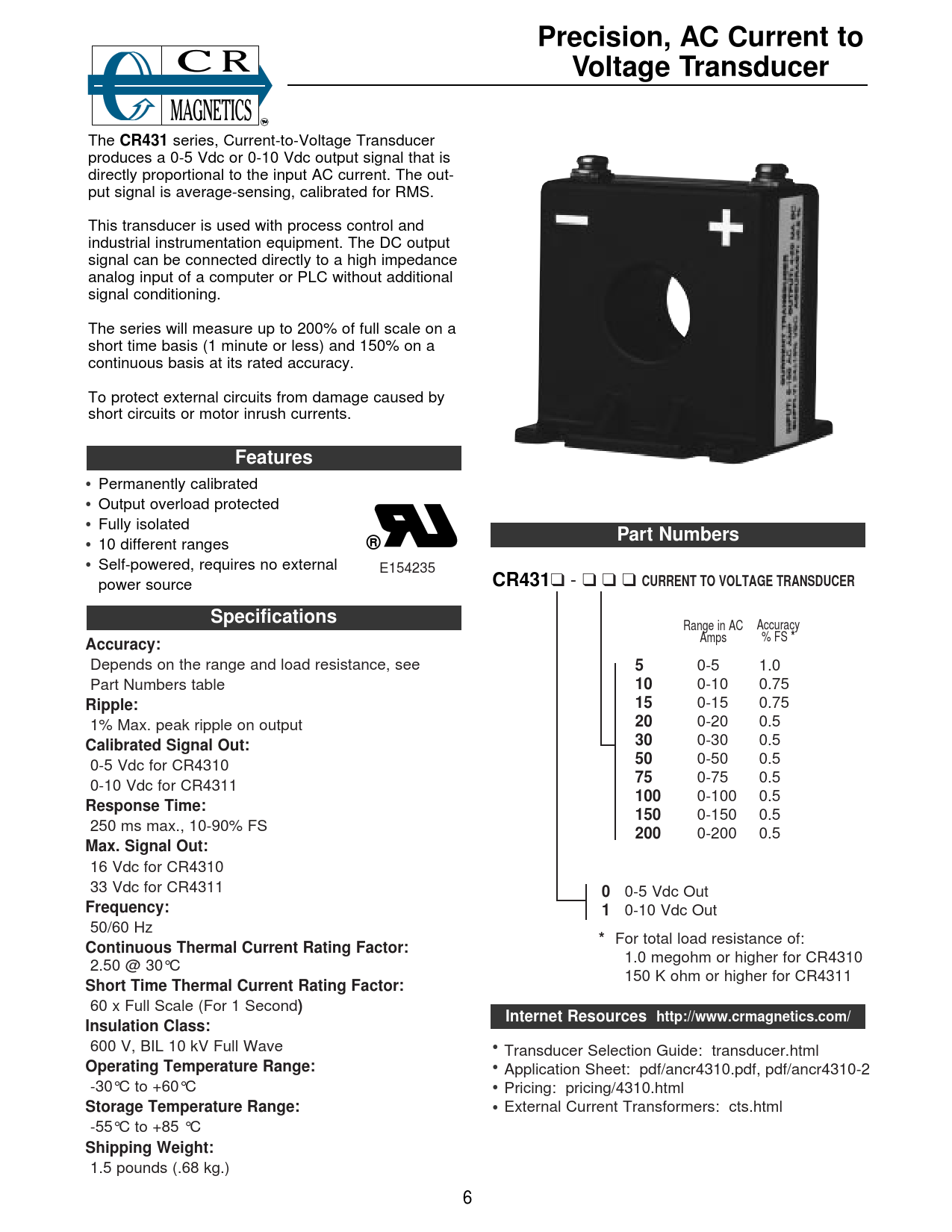 Precision, AC Current to. Voltage Transducer. CR431. Features. Part Numbers. CURRENT TO VOLTAGE TRANSDUCER. Specifications. Accuracy:
