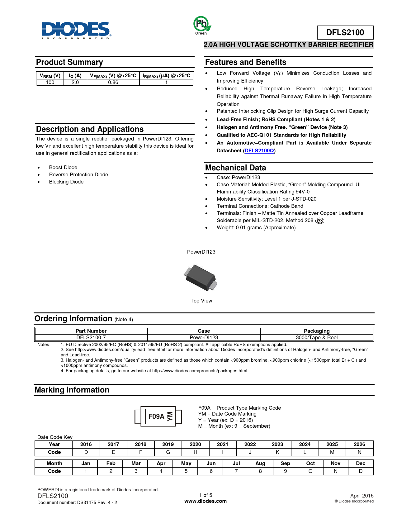Green. DFLS2100. 2.0A HIGH VOLTAGE SCHOTTKY BARRIER RECTIFIER. Product Summary. Features and Benefits. RRM (V). IO (A)