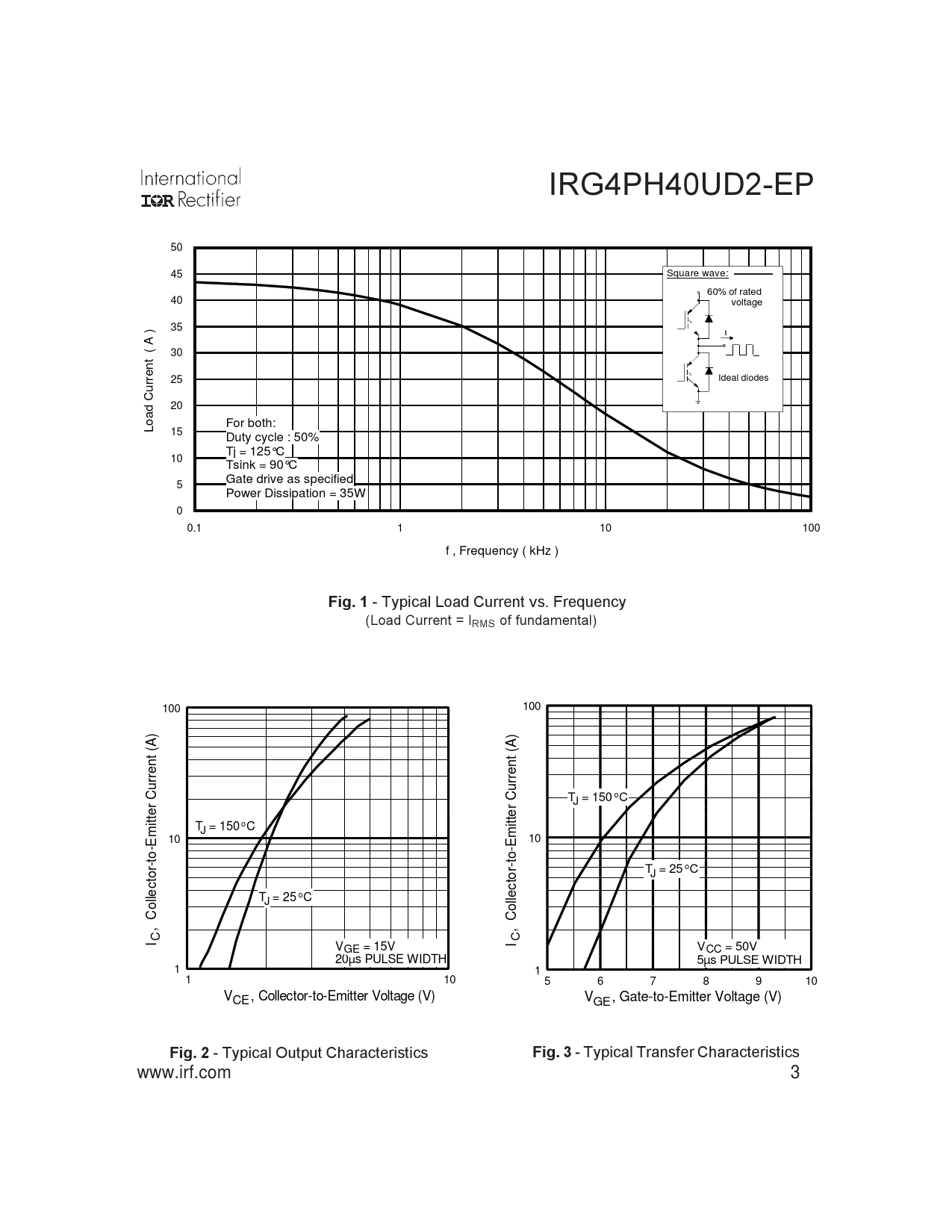 - Typical Load Current vs. Frequency (Load Current = IRMS of fundamental) 100 100 ) rrent (A u T = 150 C o J o itter C T = 150 C J m 10 10 T = 25 C o J T = 25 C o J llector-to-E o I , Collector-to-Emitter Current (A) C I , C C V = 15V GE V = 5 CC 0V 20µs PULSE WIDTH 5µs PULSE WIDTH 1 1 1 10 5 6 7 8 9 10 V , Collector-to-Emitter Voltage (V) V , Gate-to-Emitter Voltage (V) CE GE