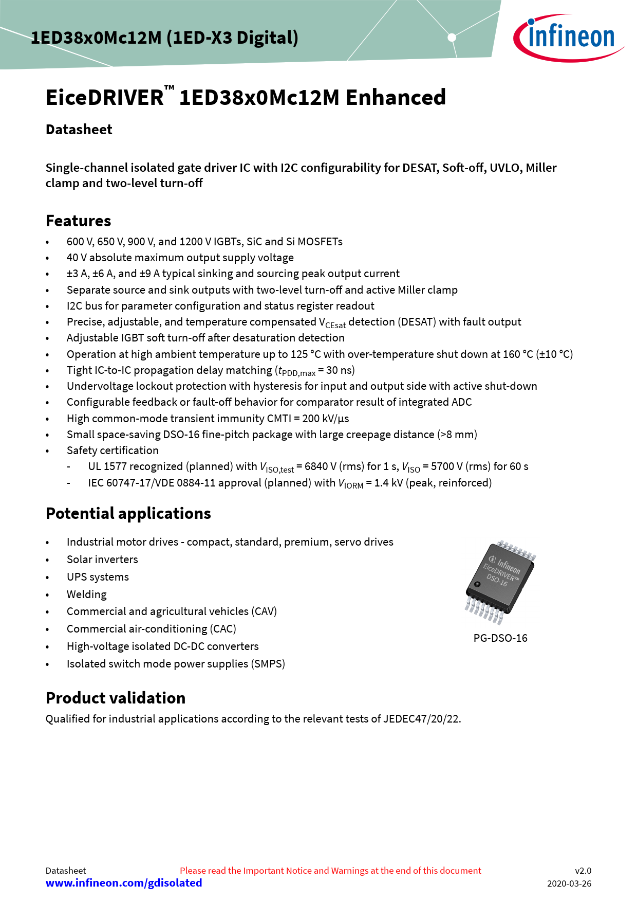 1ED38x0Mc12M (1ED-X3 Digital) EiceDRIVER™ 1ED38x0Mc12M Enhanced Datasheet Single-channel isolated gate driver IC with I2C configurability for DESAT, Soft-off, UVLO, Miller clamp and two-level turn-off Features