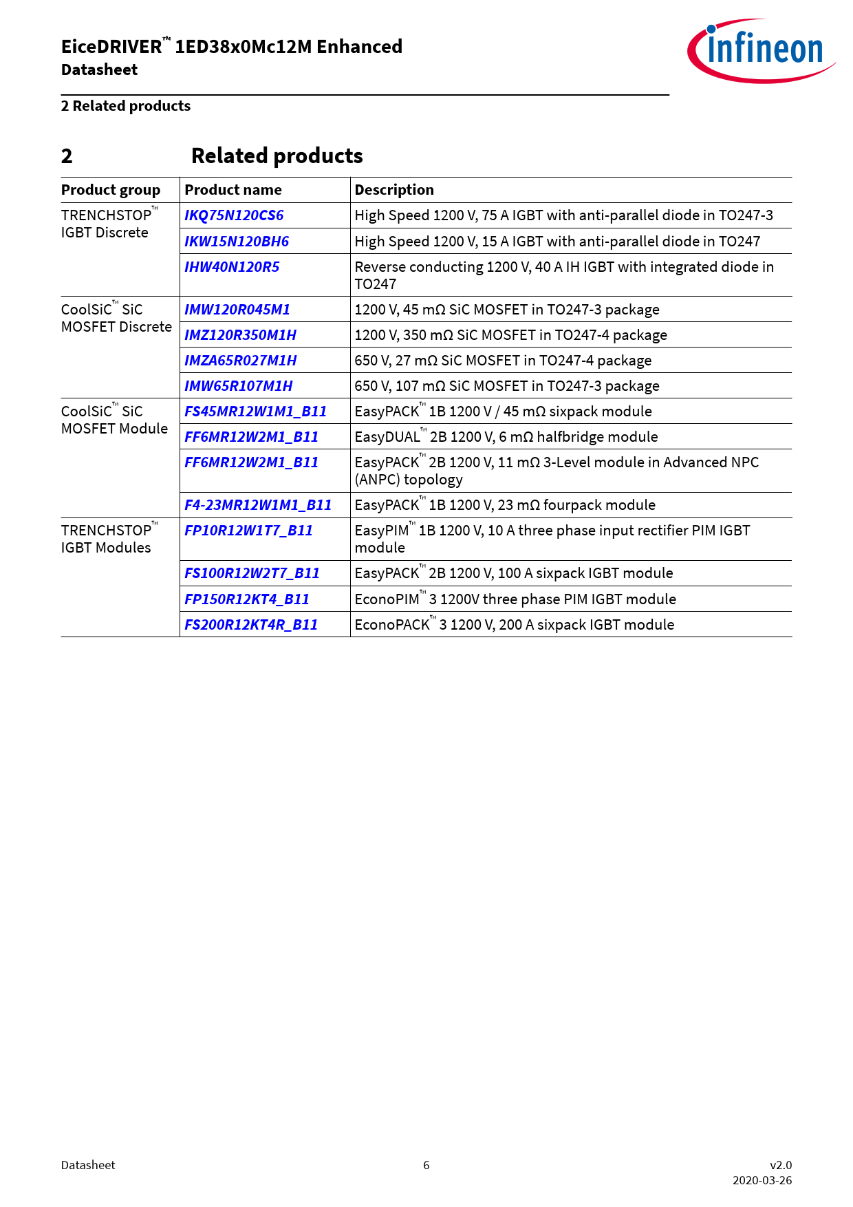 Línea de modelo para esta hoja de datos Versión de texto del documento EiceDRIVER™ 1ED38x0Mc12M Enhanced Datasheet 2 Related products 2 Related products Product group Product name Description TRENCHSTOP™IKQ75N120CS6 High Speed 1200 V, 75 A IGBT with anti-parallel diode in TO247-3 IGBT DiscreteIKW15N120BH6 High Speed 1200 V, 15 A IGBT with anti-parallel diode in TO247IHW40N120R5 Reverse conducting 1200 V, 40 A IH IGBT with integrated diode in TO247 CoolSiC™ SiCIMW120R045M1 1200 V, 45 mΩ SiC MOSFET in TO247-3 package MOSFET DiscreteIMZ120R350M1H 1200 V, 350 mΩ SiC MOSFET in TO247-4 packageIMZA65R027M1H 650 V, 27 mΩ SiC MOSFET in TO247-4 packageIMW65R107M1H 650 V, 107 mΩ SiC MOSFET in TO247-3 package CoolSiC™ SiCFS45MR12W1M1_B11 EasyPACK™ 1B 1200 V / 45 mΩ sixpack module MOSFET ModuleFF6MR12W2M1_B11 EasyDUAL™ 2B 1200 V, 6 mΩ halfbridge moduleFF6MR12W2M1_B11 EasyPACK™ 2B 1200 V, 11 mΩ 3-Level module in Advanced NPC (ANPC) topologyF4-23MR12W1M1_B11 EasyPACK™ 1B 1200 V, 23 mΩ fourpack module TRENCHSTOP™FP10R12W1T7_B11 EasyPIM™ 1B 1200 V, 10 A three phase input rectifier PIM IGBT IGBT Modules moduleFS100R12W2T7_B11 EasyPACK™ 2B 1200 V, 100 A sixpack IGBT moduleFP150R12KT4_B11 EconoPIM™ 3 1200V three phase PIM IGBT moduleFS200R12KT4R_B11 EconoPACK™ 3 1200 V, 200 A sixpack IGBT module Datasheet 6 v2.0 2020-03-26 Document Outline Table of contents 1 Block diagram 2 Related products 3 Pin configuration and functionality 3.1 Pin configuration 3.2 Pin functionality 3.3 Configurable parameters via I2C 4 Functional description 4.1 Start-up and fault clearing 4.2 Supply 4.3 Input side logic 4.4 I2C bus 4.5 Operating states 4.6 Measurement 4.7 Monitoring 4.8 Desaturation protection 4.8.1 DESAT behavior 4.9 Gate driver output 4.9.1 Turn-on behavior 4.9.2 Turn-off and fault turn-off behavior 4.9.2.1 Hard switching turn-off 4.9.2.2 Two-level turn-off 4.9.2.3 Soft turn-off 4.9.3 Active shut-down 4.9.4 Active Miller clamp 4.10 Short circuit clamping 5 Electrical parameters 5.1 Absolute maximum ratings 5.2 Thermal parameters 5.3 Operating parameters 5.4 Electrical characteristics 5.4.1 Voltage supply 5.4.2 Logic input and output 5.4.3 Gate driver 5.4.4 Active Miller clamp 5.4.5 Dynamic characteristics 5.4.6 Desaturation protection 5.4.7 Two-level turn-off 5.4.8 Soft-off current source 5.4.9 Over-temperature protection 5.4.10 ADC measurement 6 Insulation characteristics 6.1 Certified according to VDE 0884-11 and IEC 60747-17 reinforced insulation (planned) 6.2 Recognized under UL 1577 (planned) 7 Package information Revision history Disclaimer