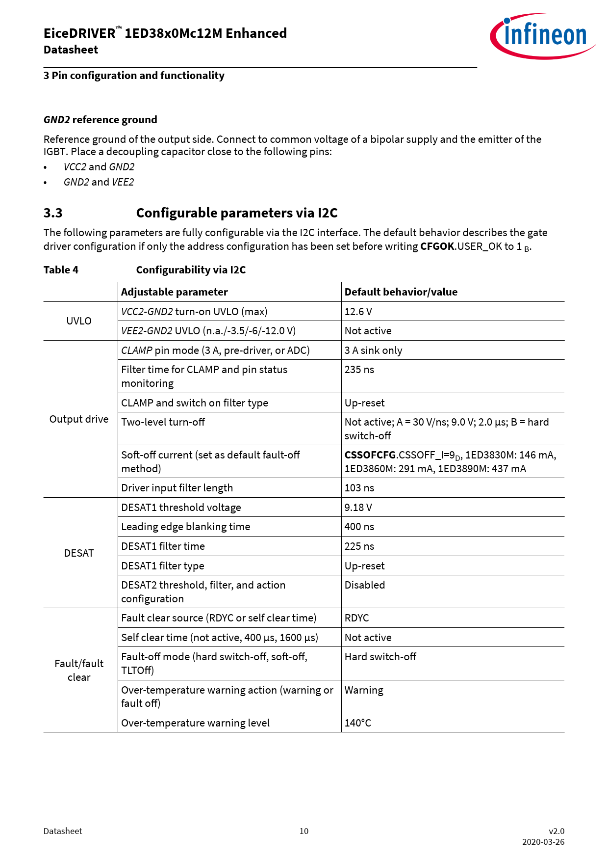 .CSSOFF_I=9D, 1ED3830M: 146 mA, method) 1ED3860M: 291 mA, 1ED3890M: 437 mA Driver input filter length 103 ns DESAT1 threshold voltage 9.18 V Leading edge blanking time 400 ns DESAT DESAT1 filter time 225 ns DESAT1 filter type Up-reset DESAT2 threshold, filter, and action Disabled configuration Fault clear source (RDYC or self clear time) RDYC Self clear time (not active, 400 µs, 1600 µs) Not active Fault/fault Fault-off mode (hard switch-off, soft-off, Hard switch-off clear TLTOff) Over-temperature warning action (warning or Warning fault off) Over-temperature warning level 140°C Datasheet 10 v2.0 2020-03-26 Document Outline Table of contents 1 Block diagram 2 Related products 3 Pin configuration and functionality 3.1 Pin configuration 3.2 Pin functionality 3.3 Configurable parameters via I2C 4 Functional description 4.1 Start-up and fault clearing 4.2 Supply 4.3 Input side logic 4.4 I2C bus 4.5 Operating states 4.6 Measurement 4.7 Monitoring 4.8 Desaturation protection 4.8.1 DESAT behavior 4.9 Gate driver output 4.9.1 Turn-on behavior 4.9.2 Turn-off and fault turn-off behavior 4.9.2.1 Hard switching turn-off 4.9.2.2 Two-level turn-off 4.9.2.3 Soft turn-off 4.9.3 Active shut-down 4.9.4 Active Miller clamp 4.10 Short circuit clamping 5 Electrical parameters 5.1 Absolute maximum ratings 5.2 Thermal parameters 5.3 Operating parameters 5.4 Electrical characteristics 5.4.1 Voltage supply 5.4.2 Logic input and output 5.4.3 Gate driver 5.4.4 Active Miller clamp 5.4.5 Dynamic characteristics 5.4.6 Desaturation protection 5.4.7 Two-level turn-off 5.4.8 Soft-off current source 5.4.9 Over-temperature protection 5.4.10 ADC measurement 6 Insulation characteristics 6.1 Certified according to VDE 0884-11 and IEC 60747-17 reinforced insulation (planned) 6.2 Recognized under UL 1577 (planned) 7 Package information Revision history Disclaimer