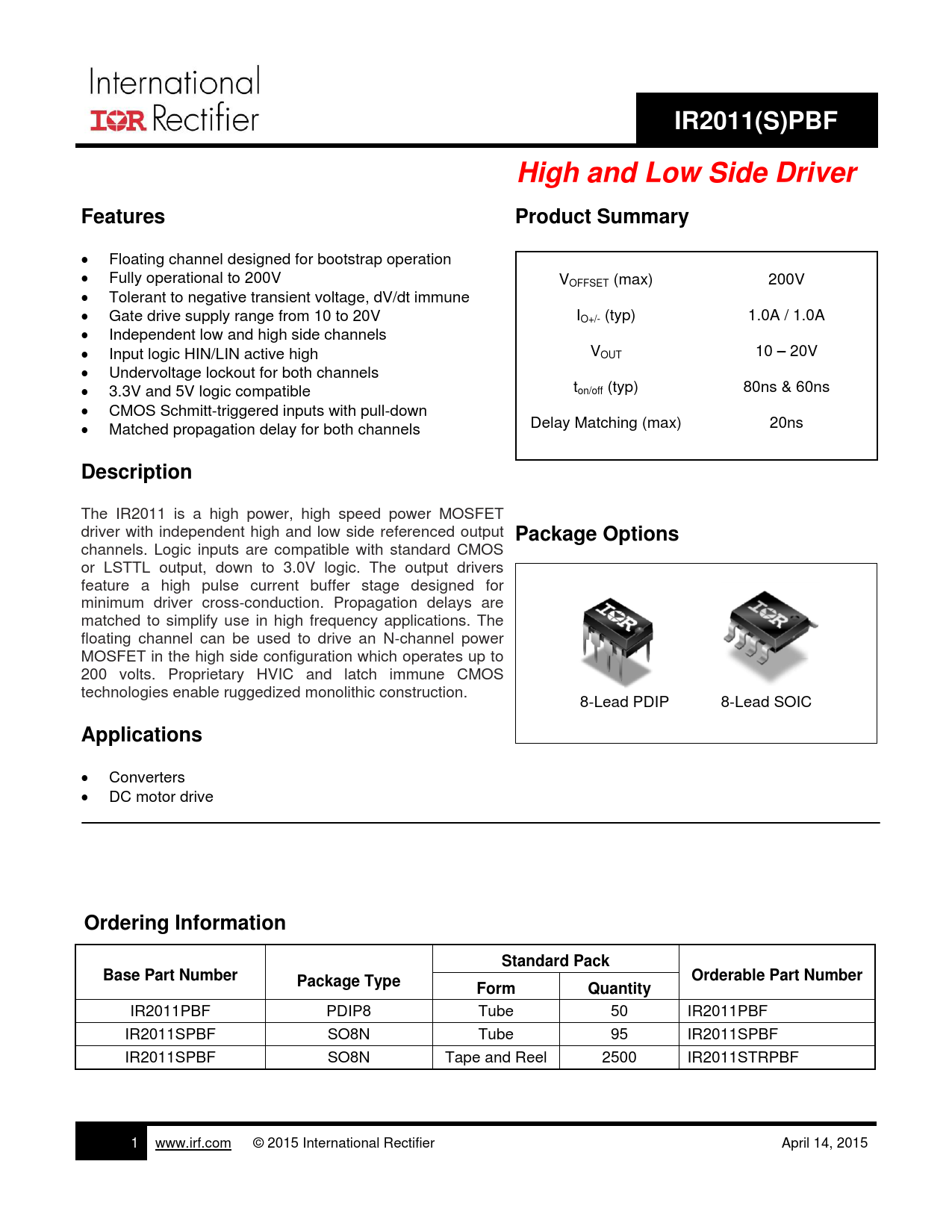 IR2011(S)PBF. High and Low Side Driver. Features. Product Summary. Description. Package Options. Applications. Ordering Information